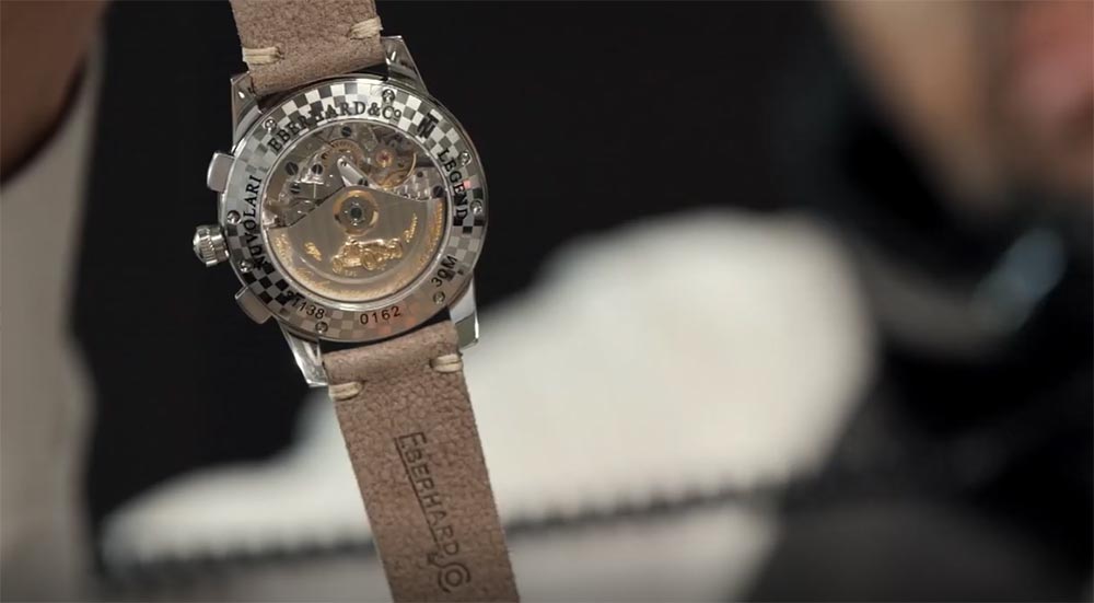 Zadní strana modelu není o nic méně podnětná a pro někoho možná ještě zábavnější než číselník. Na rotoru je zlatá podobizna vozidla Alfa Romeo TIPO "C", se kterým "The Flying Mantuan" vyhrál mnoho vítězství v Grand Prix, a zlaté nápisy ve stylizovaném písmu pod ním. Kolem průhledného otvoru, který odhaluje i část bohatě zdobeného, exkluzivního automatického Machineku Valjoux 7750, je šachovnicový vzor přesně tak, jak jej známe ze startovacích vlajek. Tvůrci znatelně věnovali velkou pozornost postavě víka a dřinu, aby dosáhli tak neuvěřitelného efektu. I pánové, kteří nejsou příznivci motorizace, budou moci okusit sentimentální kouzlo Originních závodů, historických vozů, které se jich účastní, a všech emocí, které tyto akce provázely. Eberhard oživuje tyto vzpomínky a vzdává hold Taziu Nuvolarimu, vzoru pro dnešní hráče mimo hřiště.