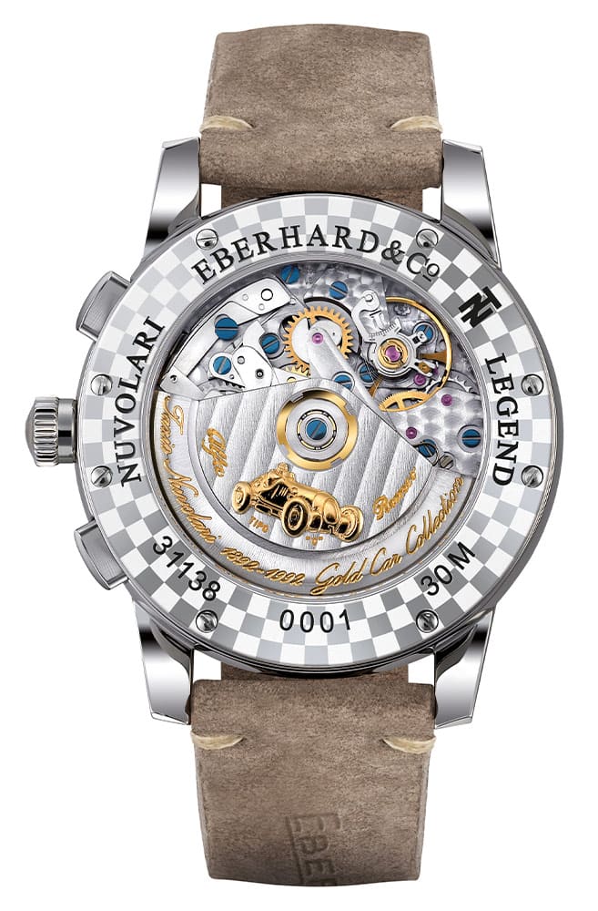 Zadní strana modelu není o nic menší důvod k odrazu a mezi některými může způsobit ještě větší zábavu než štít. Na rotoru je zlatá podobizna vozidla Alfa Romeo TIPO "C", se kterým "The Flying Mantuan" vyhrál mnoho vítězství v Grand Prix, a zlaté nápisy ve stylizovaném písmu pod ním. Kolem průhledného otvoru, který odhaluje i část bohatě zdobeného, exkluzivního automatického Machineku Valjoux 7750, je šachovnicový vzor přesně tak, jak jej známe ze startovacích vlajek. Tvůrci znatelně věnovali velkou pozornost postavě víka a dřinu, aby dosáhli tak neuvěřitelného efektu. I pánové, kteří nejsou příznivci motorizace, budou moci okusit sentimentální kouzlo Originních závodů, historických vozů, které se jich účastní, a všech emocí, které tyto akce provázely. Eberhard oživuje tyto vzpomínky a vzdává hold Taziu Nuvolarimu, vzoru pro dnešní hráče mimo hřiště.