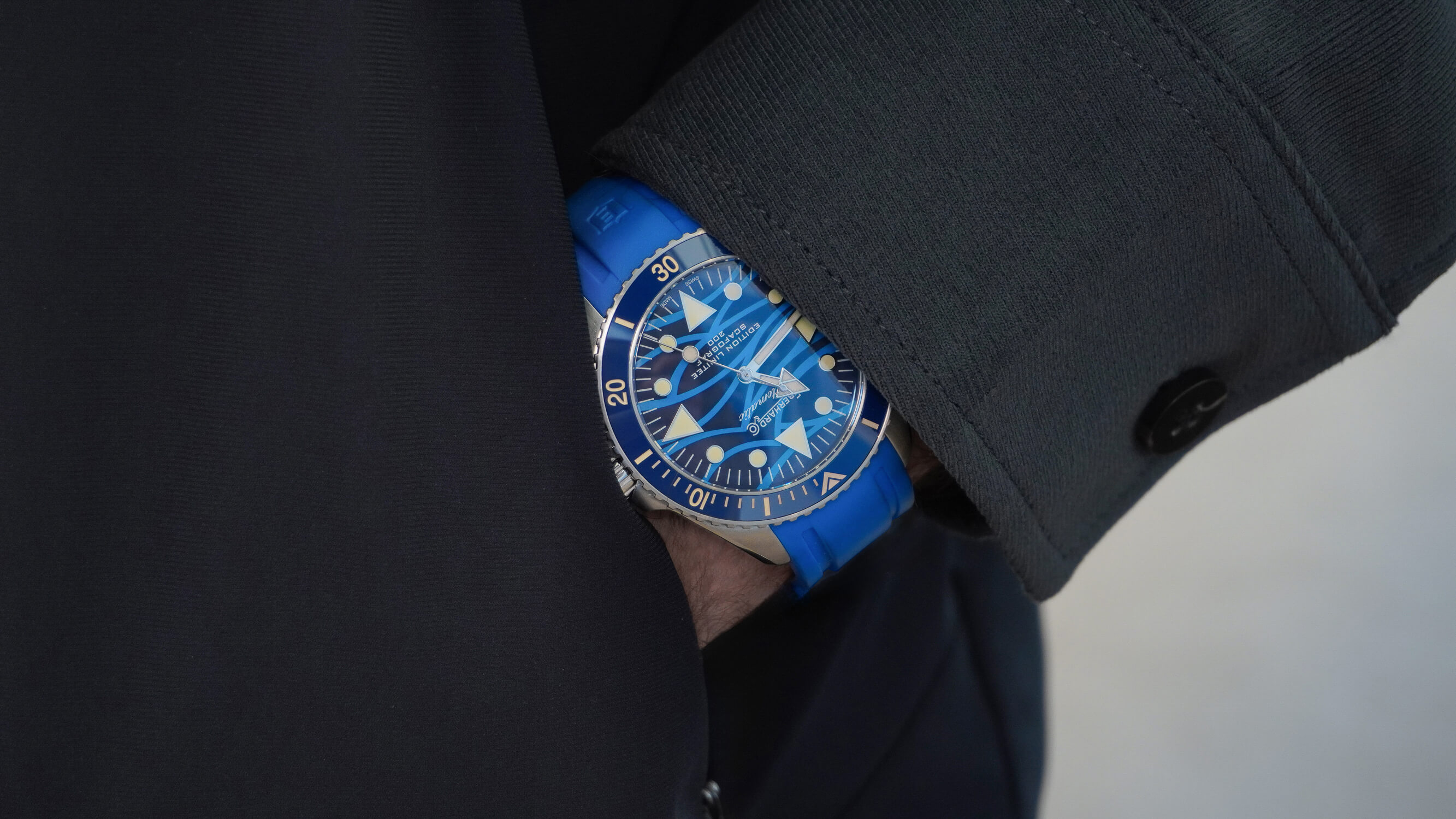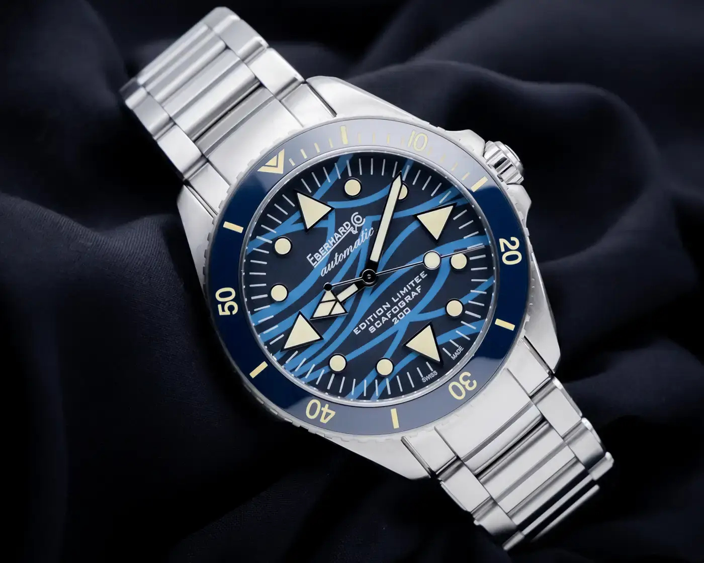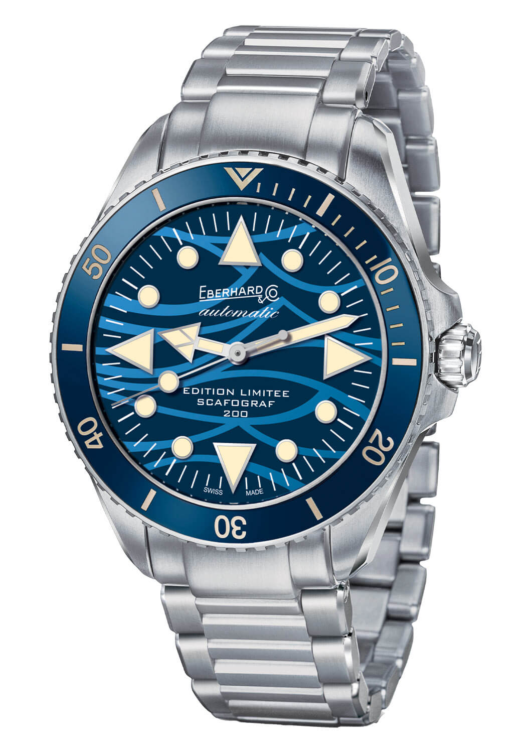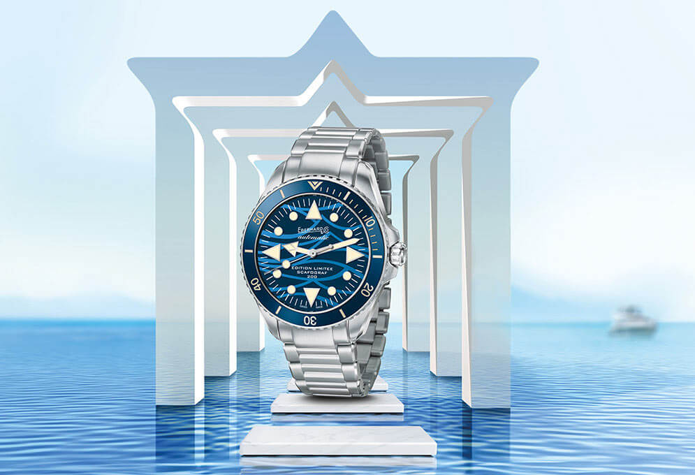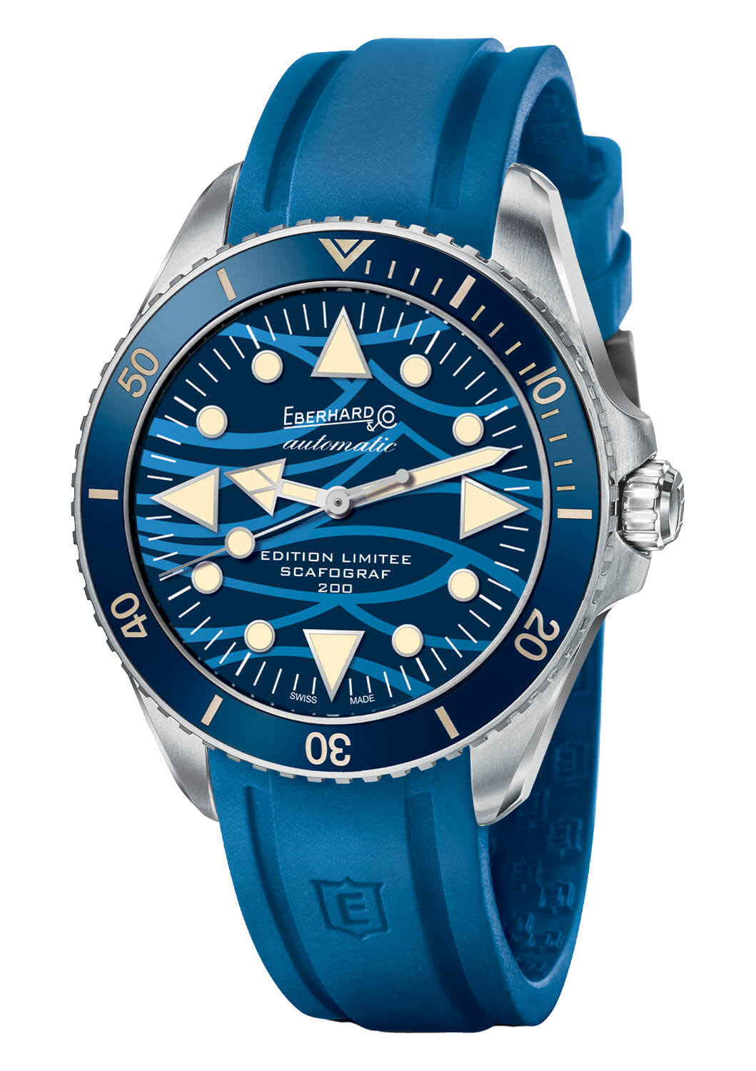 Ručně natahované náramkové hodinky Eberhard Scafograf 200 Onde Bleue se vyznačují speciálním modrým ciferníkem, zdobeným originálním světle modrým vzorem vln, symbolizujících mořské vlny. Tyto vlny se svou neustálou proměnlivostí přílivu a odlivu jsou považovány za symbol času a plynutí let. Potápěčské hodinky Eberhard Scafograf 41046 se vyznačují výraznými detaily inspirovanými jachtingem a mořem, jako jsou ručičky a indexy. Pod ciferníkem je instalován ručně natahovaný mechanismus SW200-1, který zajišťuje dokonalé měření času a rezervu chodu přibližně 40 hodin.