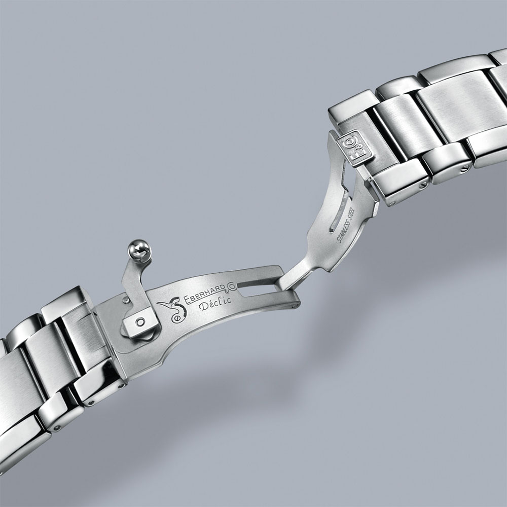 Aktuální Eberhard Scafograf 300 41034.4 CAD jsou mechanické samonatahovací nerezové diverské hodinky s průměrem pouzdra 43 mm. Jednosměrně otočný kryt lunety s keramickou vložkou, s luminiscenčními značkami po dobu prvních 15 minut. Klenuté safírové sklo s antireflexní vrstvou a automatickým heliovým ventilkem v pouzdře na 9 hod. Černý 'galbé' číselník má luminiscenční indexy a bílé datumové okénko na 3 hod. Název modelu a centrální sekundová ručička jsou v bílé barvě. Hodinová a minutová ručička jsou také vyplněny luminiscenční látkou. Voděodolný do 30 bar/300 m díky šroubovacímu zadnímu pouzdru, které je personalizováno vyrytou hvězdicí. Model je dodáván s patentovaným designem náramku CHASSIS®. Vyrobeno z nerezové oceli, má speciální zapínání DÉCLIC® . Používání je velmi bezpečné, nehrozí náhodné odepnutí a ztráta hodinek. Z boku náramku vyčnívá kulovitá spona, kterou je nutné posunout pro otevření nebo zavření náramku.