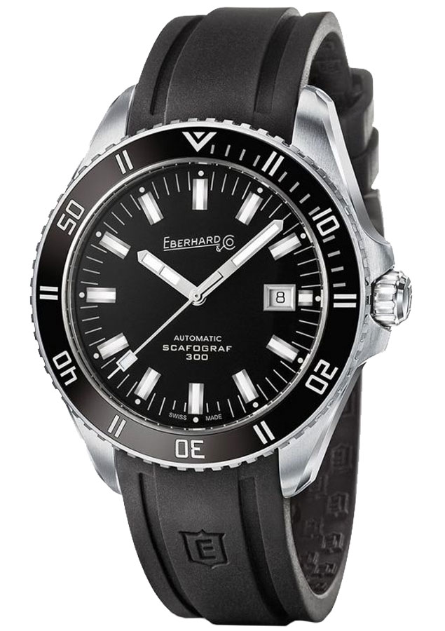Aktuální Eberhard Scafograf 300 41034.4 CU jsou mechanické samonatahovací nerezové diverské hodinky s průměrem pouzdra 43 mm. Jednosměrně otočný kryt lunety s keramickou vložkou, s luminiscenčními značkami po dobu prvních 15 minut. Klenuté safírové sklo s antireflexní vrstvou a automatickým heliovým ventilkem v pouzdře na 9 hod. Černý 'galbé' číselník má luminiscenční indexy a bílé datumové okénko na 3 hod. Název modelu a centrální sekundová ručička jsou v bílé barvě. Hodinová a minutová ručička jsou také vyplněny luminiscenční látkou. Voděodolný do 30 bar/300 m díky šroubovacímu zadnímu pouzdru, které je personalizováno vyrytou hvězdicí. Model je dodáván s integrovaným černým gumovým páskem ideální pro plavání.