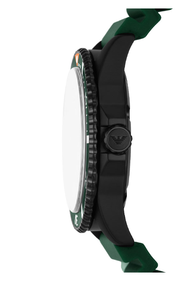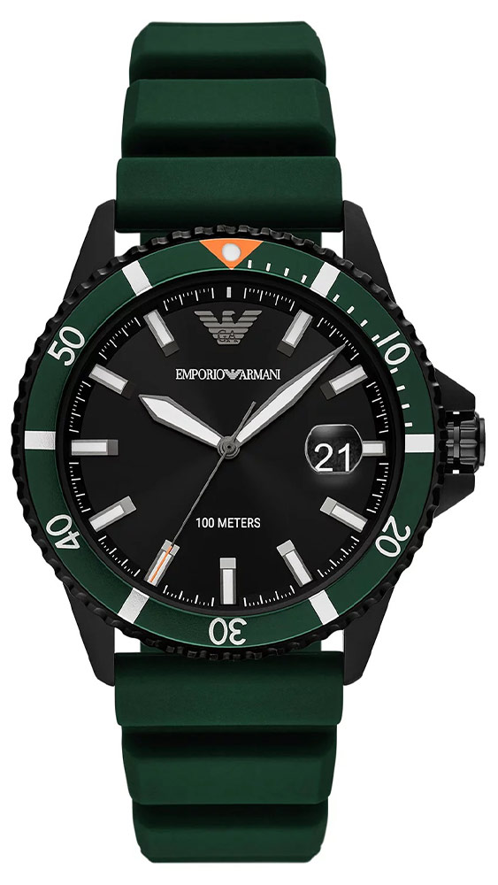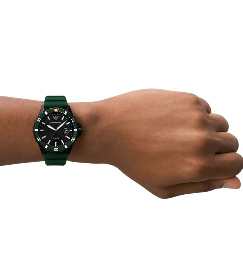 Emporio Armani je jednou z nejznámějších módních značek na světě. Hodinky AR11464 z kolekce Diver jsou novým návrhem diverských hodinek od módní značky, která již léta udává trendy ve světě módy. Hodinky Emporio Armani Diver AR11464 podporované tmavým barevným schématem jsou černé kulaté ocelové pouzdro potažené PVD a zelený kaučukový řemínek připevněný k jejich okům. Na pouzdře je zelený otočný kroužek, který vám umožní snadněji počítat čas například pod vodou. Na černém ciferníku najdeme kromě čitelných velkých ruček a lineárních indexů datumové okénko na 3. hodině se speciálním zvětšením. Třída vodotěsnosti 10 bar (až 100 metrů) vám umožní potápět se s hodinkami na zápěstí. Šroubovací zadní část pouzdra pomáhá utěsnit mechanismus hodinek. Srdcem hodinek je quartzový Machineek napájený baterií.