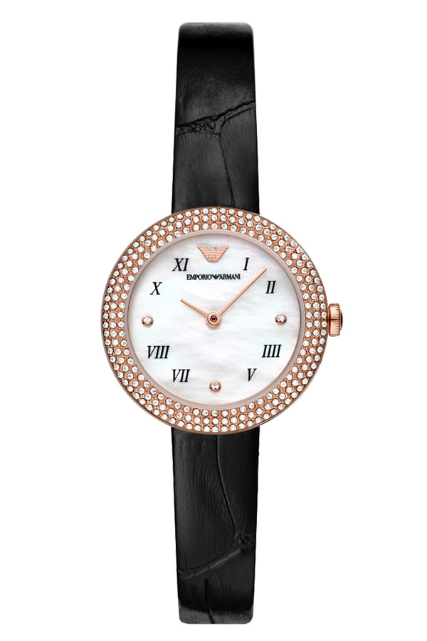 Módní hodinky Emporio Armani Rosa. AR11356 je model pro ženy, které milují módní doplňky. Hodinky z kolekce Rosa se vyznačují kulatým růžově pozlaceným PVD pouzdrem zdobeným kubickými zirkony a hladkým černým koženým řemínkem připevněným k očkům. Logo značky Emporio Armani zdobí čirý perlový ciferník na dvanácté hodině, zatímco římské číslice a zirkonové krystaly jsou smíchány v hodinových bodech. Srdcem hodinek je quartzový Machineek, který je napájen baterií. Emporio Armani Rosa AR11356 jsou hodinky, které budou dokonale odpovídat aktuálním trendům ve světě módy. Model AR11356 je příkladem hodinek, které se budou hodit do ležérního i ležérního outfitu.