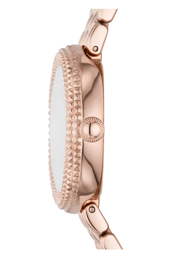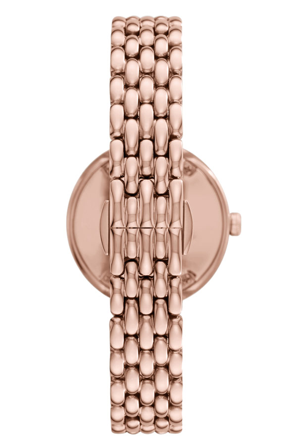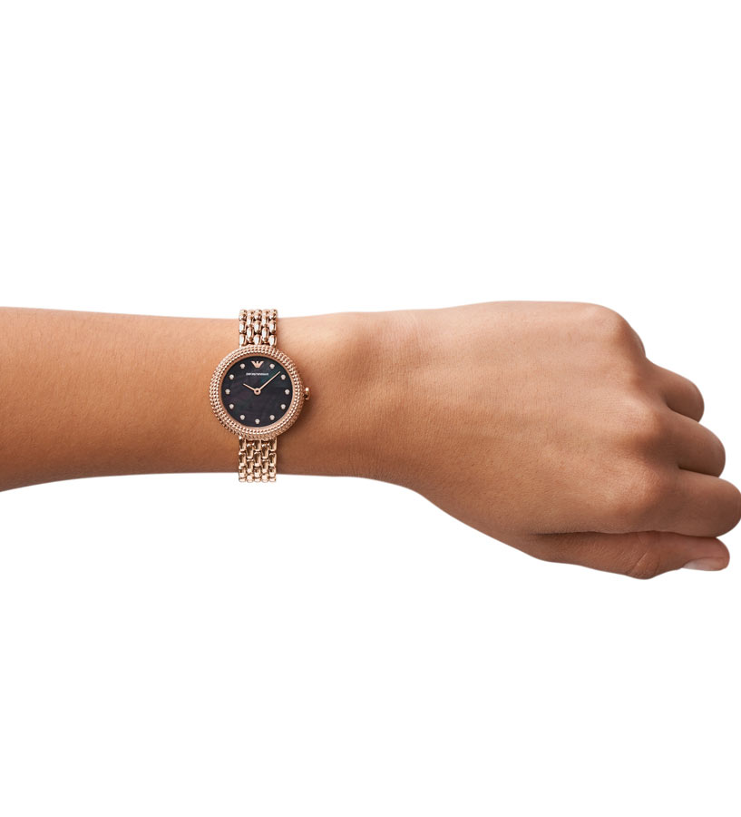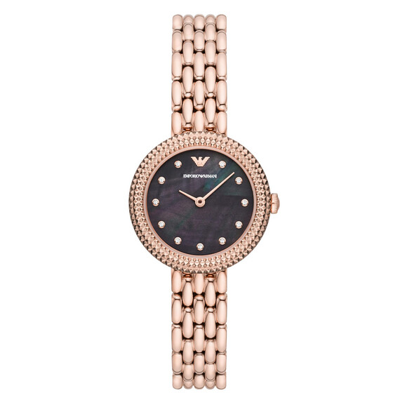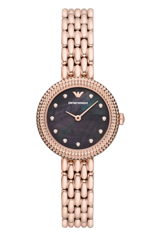Dámské hodinky módního domu Emporio Armani Rosa. AR11432 je model pro ženy, které milují elegantní doplňky. Hodinky z kolekce Rosa jsou kulaté růžově pozlacené PVD pouzdro a jemný pozlacený náramek s motýlkovou sponou připevněnou k jeho ouškám. Ve dvanáct hodin zdobí logo značky Emporio Armani perleťový ciferník a zirkonové krystaly na hodinových bodech. Srdcem hodinek je quartzový Machineek, který je napájen baterií. Emporio Armani Rosa AR11432 jsou hodinky, které budou dokonale odpovídat aktuálním trendům ve světě módy. Model AR11432 je skvělý nápad, jak doplnit každodenní i elegantní outfity.