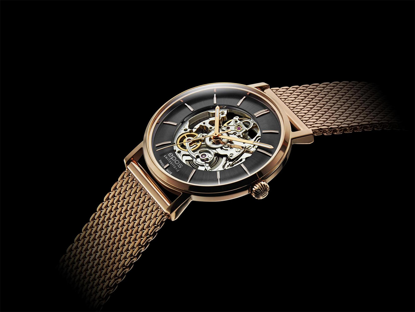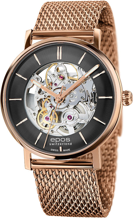 Epos Originale Retro Skeleton 3437.135.24.15.34 v sobě spojuje kouzlo 50. let s nádherným vzhledem skeletonového Machineku Sellita SW 200. Retro hodinky EPOS se vyznačují zakřiveným a skeletonizovaným ciferníkem, který prozrazuje nádherně zpracovaný automatický Machineek. Kromě výřezů má ciferník vzor, který elegantním způsobem šíří světelné paprsky, vystupující indexy s luminiscenční hmotou, která je i na ručičkách. Vysoce kvalitní skeletové hodinky EPOS 3437SK mají tenké pouzdro pozlacené PVD růžovým zlatem se silně zakřiveným safírovým sklíčkem. Díky tloušťce pouhých 9,9 milimetrů a průměru 38,5 milimetrů se hodinky velmi pohodlně nosí.