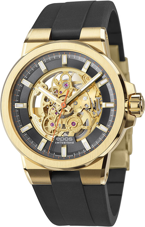 Nejnovějším přírůstkem do sportovního světa Epos jsou dynamické hodinky Epos Sportive Skeleton 3442.136.22.14.55 . Vybaveno nádherně zdobenou kostrou automatického Machineku Sellita SW200. Žluté PVD pozlacené pouzdro s matným povrchem a leštěnými hranami je integrováno černým gumovým páskem. Jeho rozměry jsou 10,40 mm tlusté a 42 mm v průměru. Dalším vrcholem je rafinovaný dvouvrstvý ciferník s povrchovou úpravou Sunray a ručně aplikovanými indexy s víceúhlovým leštěním.