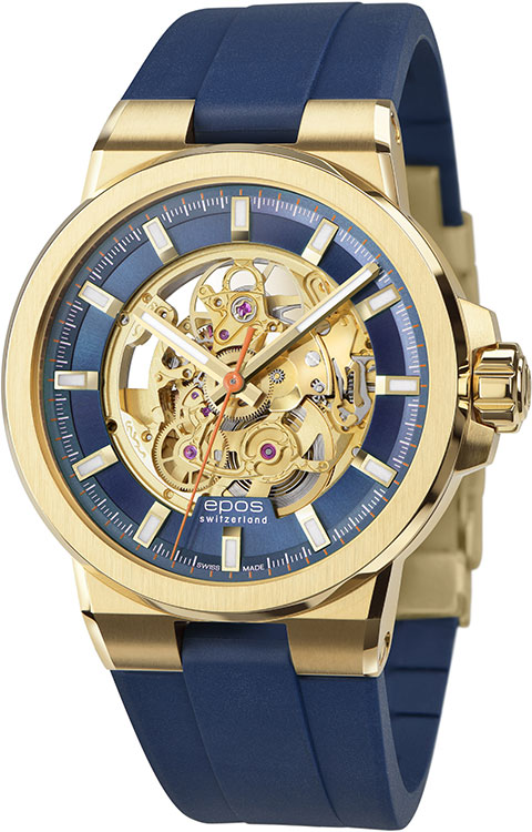 Nejnovějším přírůstkem do sportovního světa Epos jsou dynamické hodinky Epos Sportive Skeleton 3442.135.20.16.56 . Vybaveno nádherně zdobenou kostrou automatického Machineku Sellita SW200. Žluté PVD pozlacené pouzdro s matným povrchem a leštěnými hranami je integrováno s modrým gumovým páskem. Jeho rozměry jsou 10,40 mm tlusté a 42 mm v průměru. Dalším vrcholem je rafinovaný dvouvrstvý ciferník s povrchovou úpravou Sunray a ručně aplikovanými indexy s víceúhlovým leštěním.