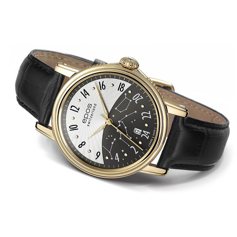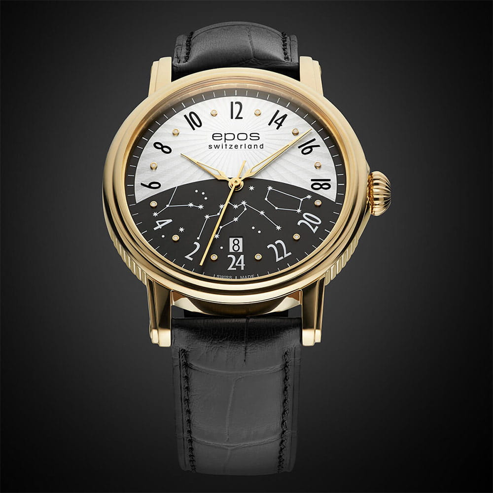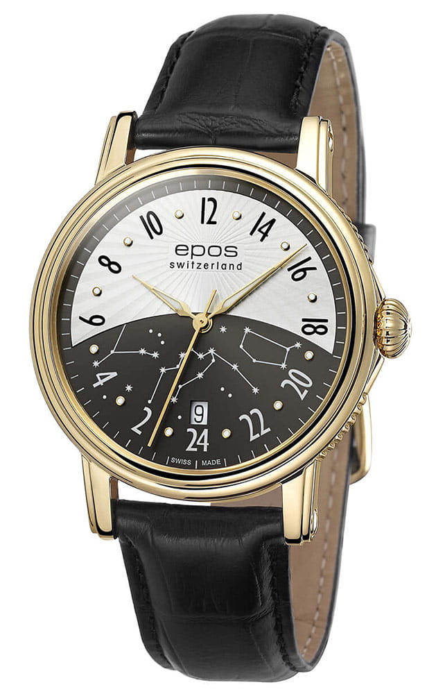 Epos Emotion 24 H 3390.302.22.38.25 jsou exkluzivní hodinky švýcarské společnosti Epos, s automatickým Machinekem ETA 2892, upravené a zdobené inženýry Eposu. Toto mistrovské dílo vás bude provázet po celý den s plnohodnotným 24hodinovým číselníkem. Datumové okénko s číslem dne v týdnu je na 6. hodině Pouzdro je vyrobeno z nerezové oceli, leštěno do vysokého lesku, zlaceno žlutým PVD zlatem, se šroubovacím víčkem, přes které se krásně je vidět zdobený mechanismus. Číselník je rozdělen na denní a noční část, což usnadňuje a rychle odečítá čas. Krásná ilustrace s hvězdnou oblohou ve spodní části ciferníku a elegantně vyrobeným sluncem v horní části.
