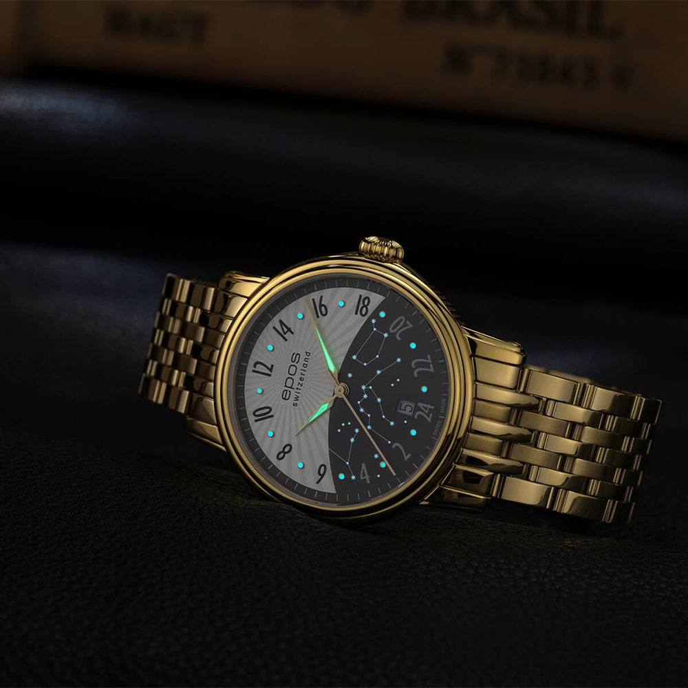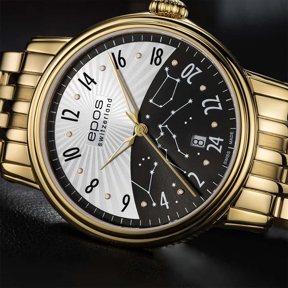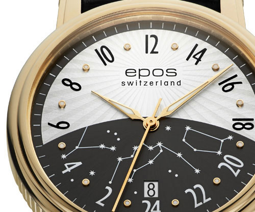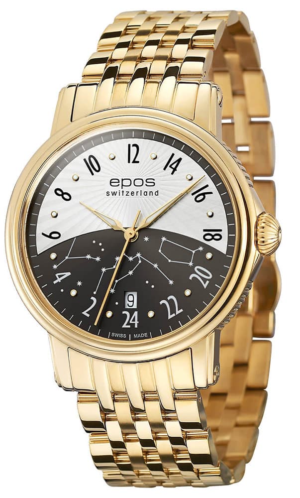 Epos Emotion 24 H 3390.302.22.38.32 jsou exkluzivní hodinky švýcarské společnosti Epos, s automatickým Machinekem ETA 2892, upravené a zdobené inženýry Eposu. Toto mistrovské dílo vás bude provázet po celý den s plnohodnotným 24hodinovým číselníkem. Datumové okénko s číslem dne v týdnu je na 6. hodině Pouzdro je vyrobeno z nerezové oceli, leštěno do vysokého lesku, zlaceno žlutým PVD zlatem, se šroubovacím víčkem, přes které se krásně je vidět zdobený mechanismus. Číselník je rozdělen na denní a noční část, což usnadňuje a rychle odečítá čas. Krásná ilustrace s hvězdnou oblohou ve spodní části ciferníku a elegantně vyrobeným sluncem v horní části.