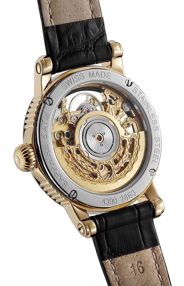 Dámské hodinky Epos Ladies 4390 SK Skeleton 4390156222515 jsou umístěny v kulatém pozlaceném ocelovém pouzdře Emotion s charakteristickými výřezy na bocích. Pouzdro 34 mm padne na zápěstí každé ženy. Výrobce hodinky zkombinoval s elegantním koženým řemínkem s klasickým zapínáním na přezku. Popruh je měkký a lehký, což zajistí pohodlí při jeho používání. Unikátní pouzdro má speciální zapínání - teleskopy držící řemínek jsou přišroubovány speciálními šrouby po stranách jeho oček. Na zadní straně pouzdra je víko s okénkem, které umožňuje sledovat činnost mechanismu. Hodinky Epos jsou vybaveny automatickým Machinekem SW300 s rezervou chodu až 42 hodin. Švýcarský Machineek Sellita je přesný a jeho komplikovanou konstrukci a práci lze pozorovat díky skeletovému ciferníku, který je umístěn pod extrémně tvrdým a těžko poškrábatelným safírovým sklíčkem.