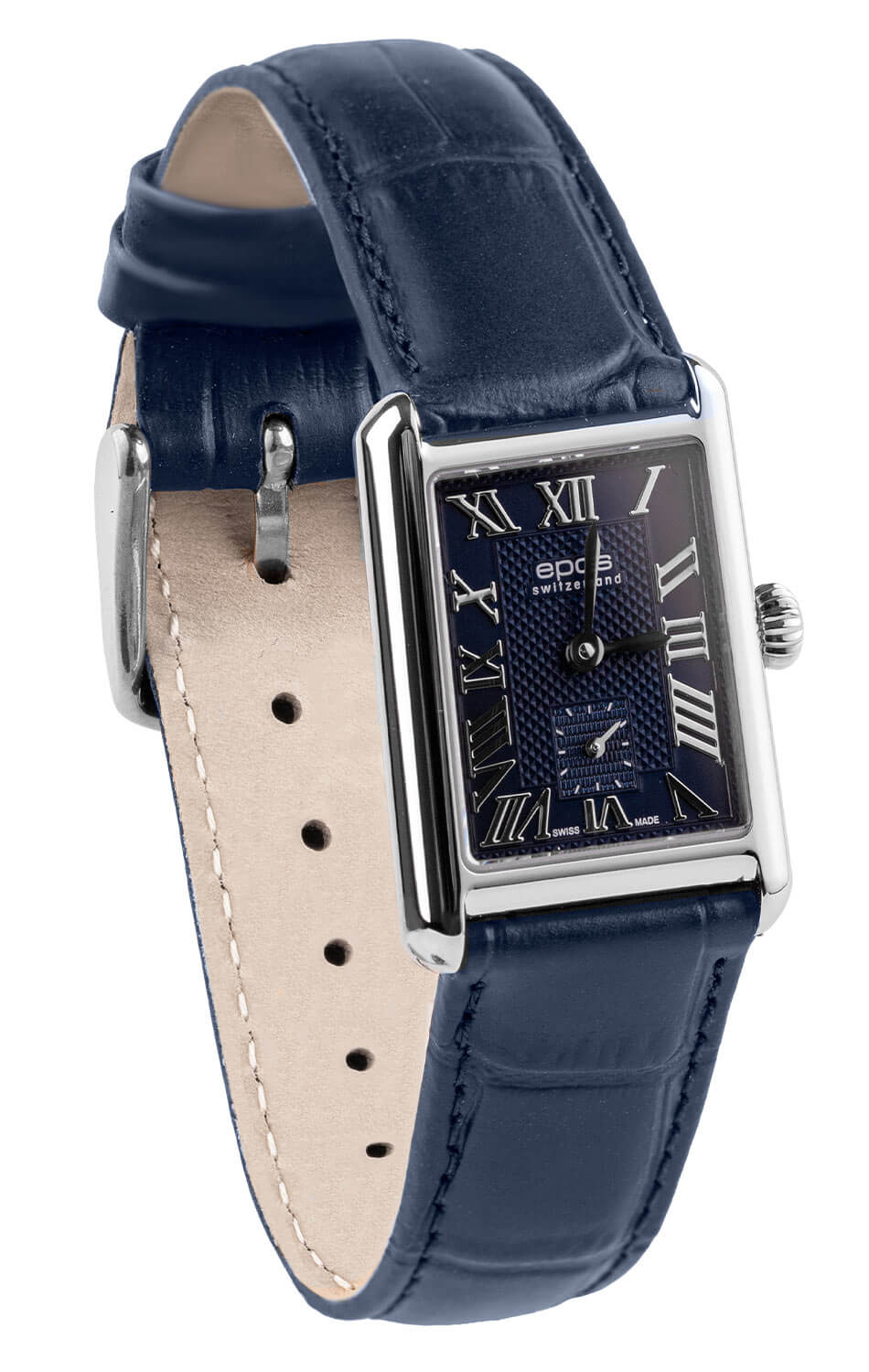 Pouzdro s geometrickými liniemi a ladící modrý kožený řemínek tvoří jednotný, harmonický celek. Módní barevné provedení dodává hodinkám klasický a ušlechtilý tón, zatímco safírové sklíčko chrání ciferník před poškrábáním a zaručuje dlouhotrvající lesk i bezchybný vzhled. Hodinky vynikají jemností zpracování typickou pro manufakturu Epos – značku, která již mnoho let pěstuje tradici klasického hodinářství.