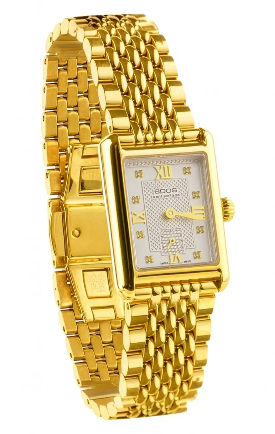 Pouzdro s geometrickou linií a přizpůsobený náramek tvoří jednotný, harmonický celek. Zlatá vrstva PVD dodává celku ušlechtilý tón a safírové sklo chrání číselník před poškrábáním, což zaručuje dlouhotrvající lesk a bezchybný vzhled. Hodinky se vyznačují jemností provedení, charakteristickou pro manufakturu Epos — značku, která již léta pěstuje tradici klasického hodinářství.