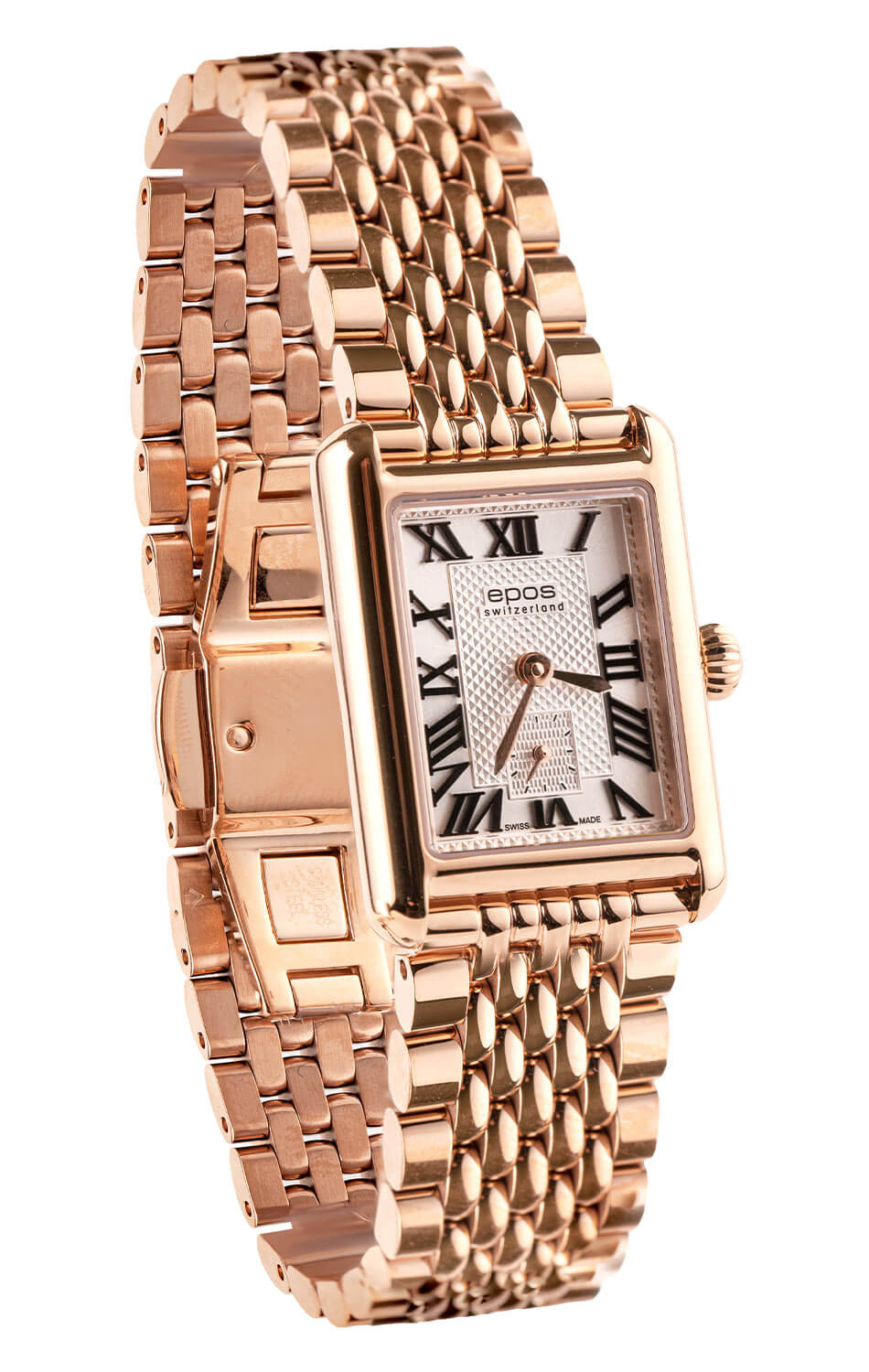 Pouzdro s geometrickými liniemi a přizpůsobený náramek z ušlechtilé oceli tvoří soudržný, harmonický celek – hodinky jsou pozlacené růžově zlatou vrstvou PVD. Zlatý odstín dodává celku klasický a ušlechtilý tón, zatímco safírové sklíčko chrání ciferník před poškrábáním a zaručuje dlouhotrvající lesk i bezchybný vzhled. Hodinky se vyznačují jemností zpracování, typickou pro manufakturu Epos – značku, která již po léta pečuje o tradici klasického hodinářství.