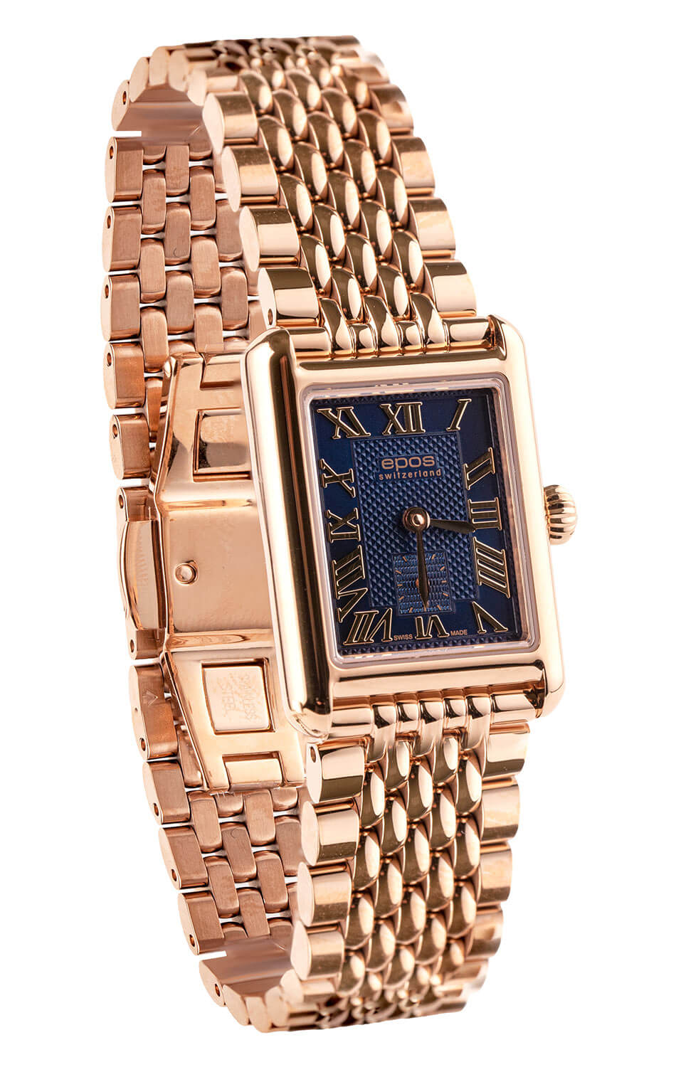 Pouzdro s geometrickými liniemi a přizpůsobený náramek z ušlechtilé oceli tvoří soudržný, harmonický celek – hodinky jsou pozlacené růžově zlatou vrstvou PVD. Zlatý odstín dodává celku klasický a ušlechtilý tón, zatímco safírové sklíčko chrání ciferník před poškrábáním a zaručuje dlouhotrvající lesk i bezchybný vzhled. Hodinky se vyznačují jemností zpracování, typickou pro manufakturu Epos – značku, která již po léta pečuje o tradici klasického hodinářství.