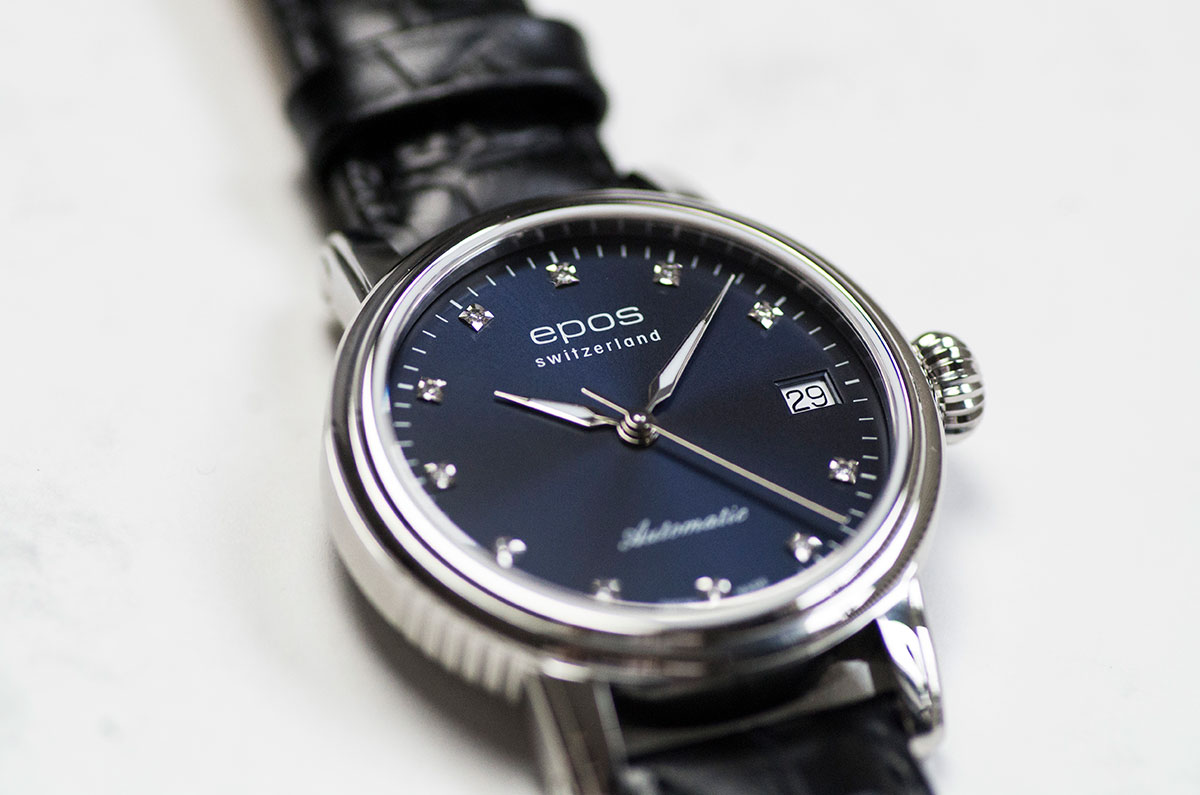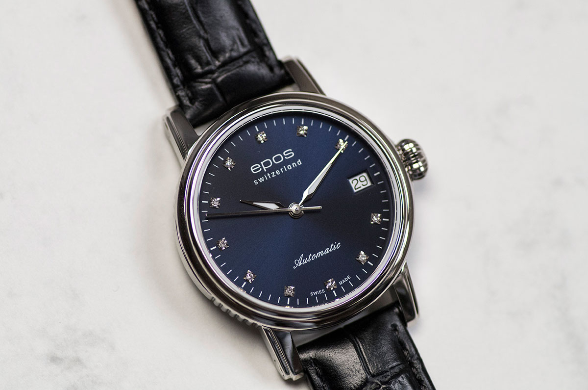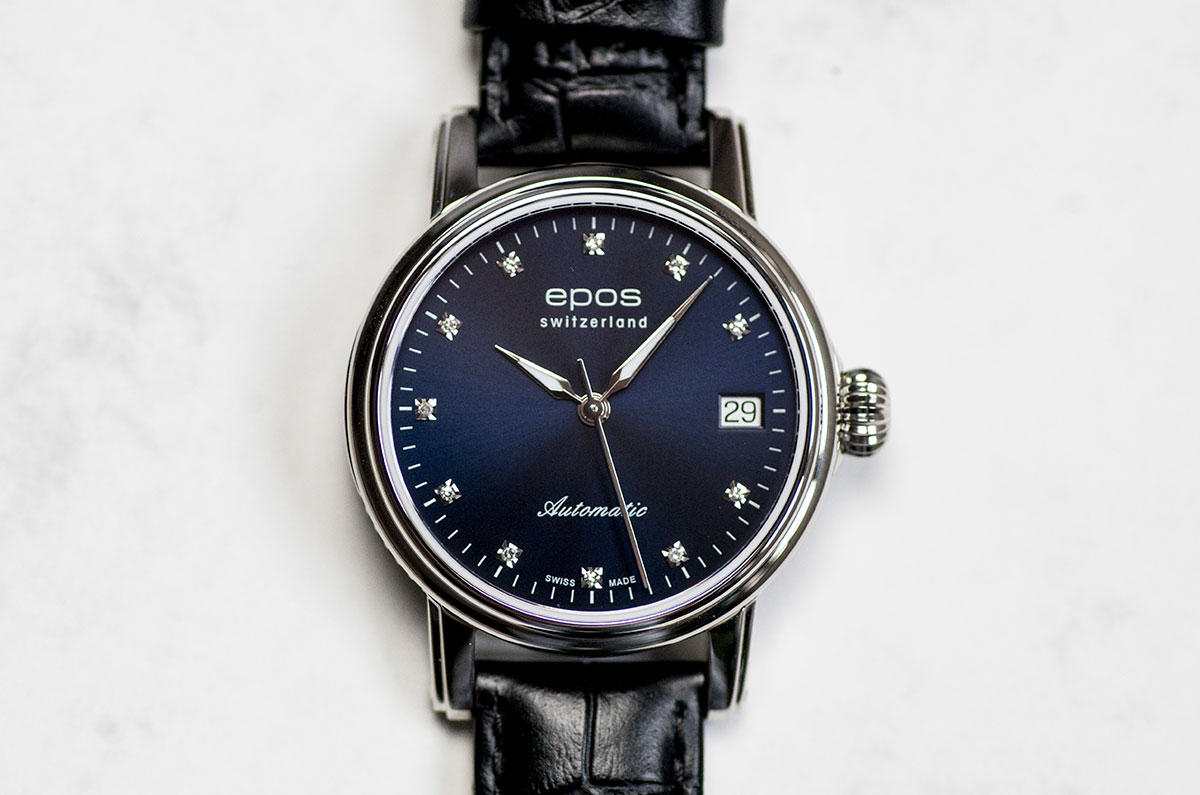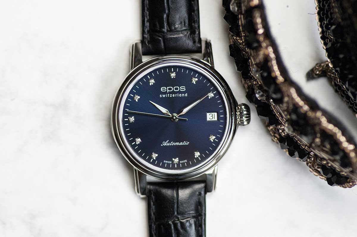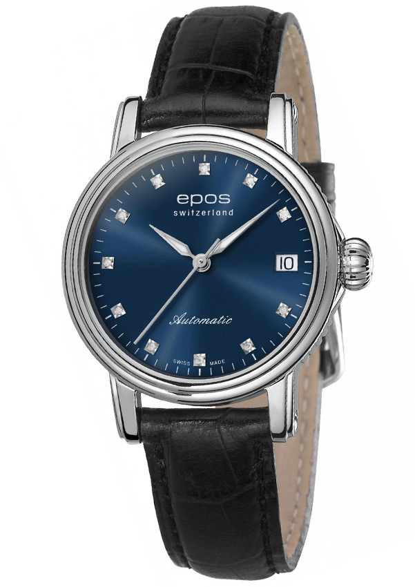 Krásné dámské hodinky Epos Ladies Diamond 4390.152.20.86.15 zdobené diamanty. Na elegantní modrý číselník umístili hodináři Epos třpytivé diamanty, které fungují jako indexy. Jejich záře osvětlí nejen hodinky, ale i majitele. Elegantní pouzdro z nerezové oceli je vyleštěno do vysokého lesku a svislé zdobení dodává eleganci. Průhledné dno hodinek odhaluje krásně zpracovaný automatický Machineek. Pohodlný černý kožený řemínek zdobí vzor aligátora.
