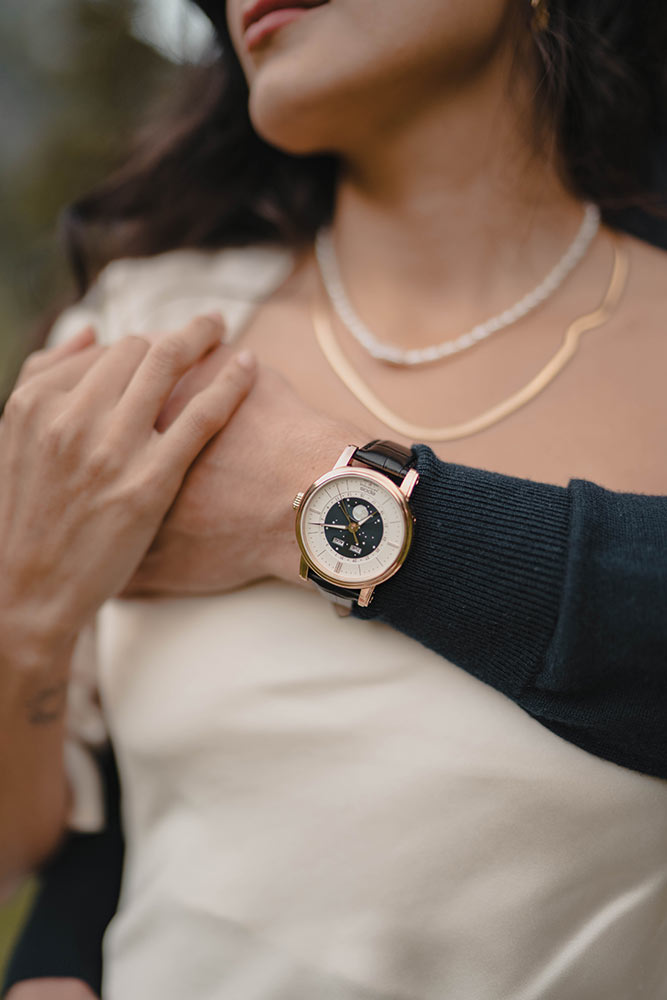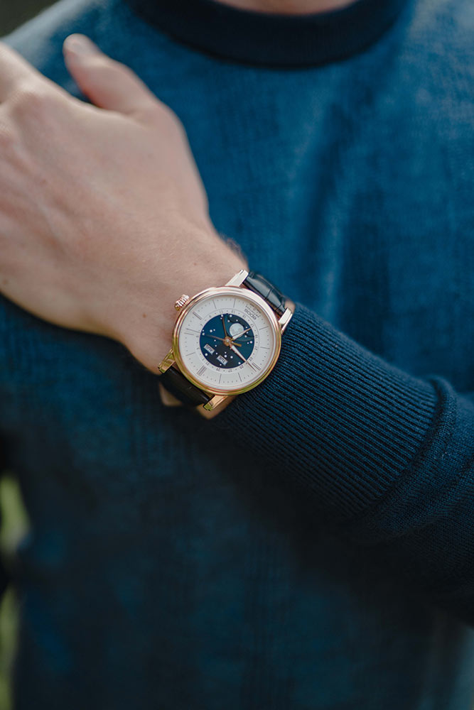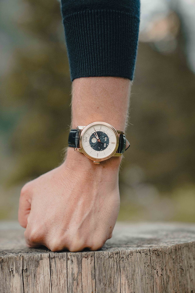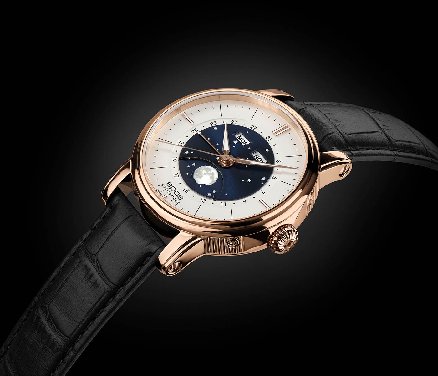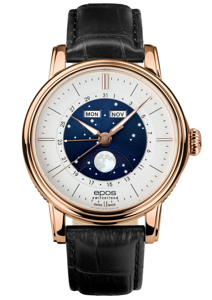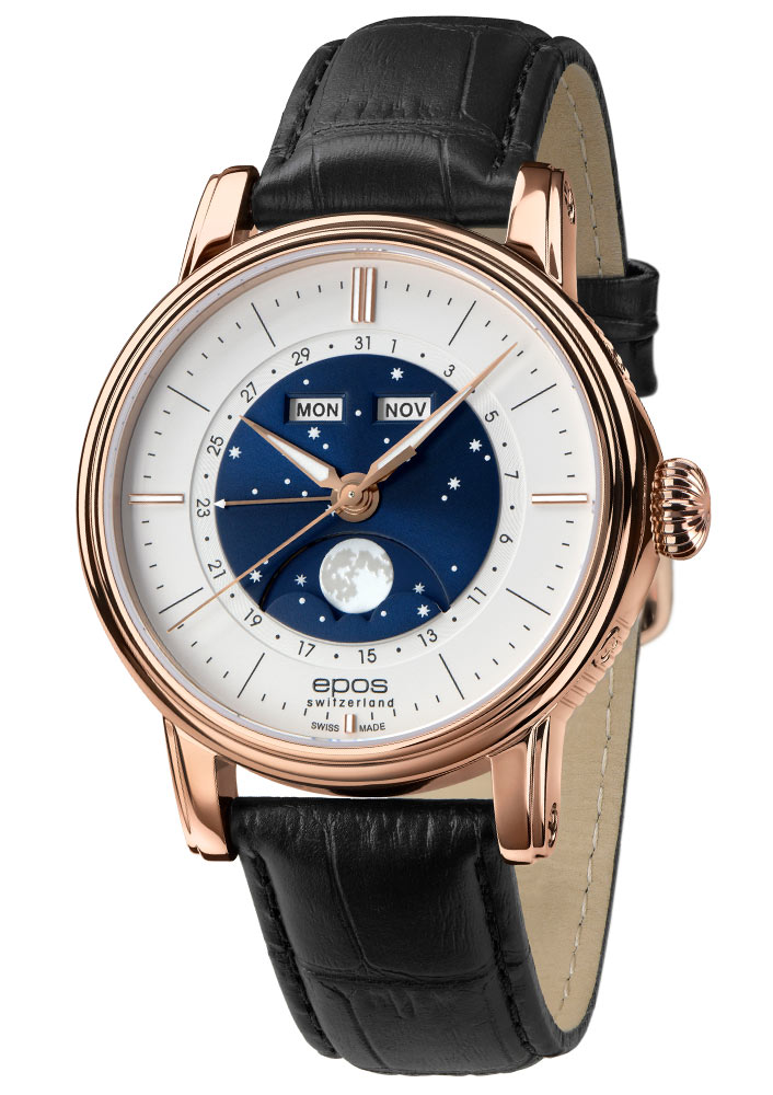 Epos Oeuvre D'Art Classic 3439.322.24.18.25 v krásném růžově pozlaceném PVD pouzdru o průměru 41,7 mm . Uvnitř je automatický Machineek Sellita SW300 s modulem Epos Big Moon navrženým inženýry Epos. Machineek je vyroben s důrazem na nejmenší detail a zdoben krásným vzorem Côtes de Genève , který je viditelný přes safírově glazované šroubovací pouzdro. Další funkce, jako je zobrazení dne v týdnu a měsíce, zobrazení data a extra velké zobrazení fáze měsíce, jsou oblíbené funkce většiny nadšenců do hodinek a stále jsou na těchto pozoruhodných hodinkách.