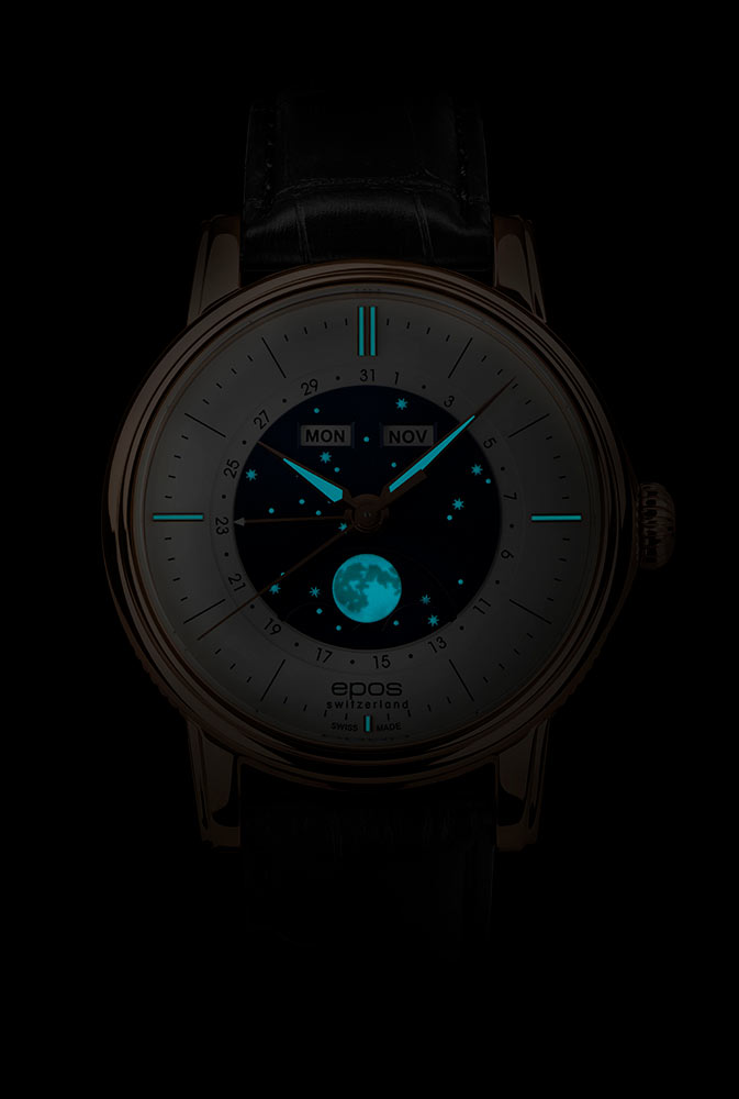 Elegantní Epos 3439 Classic cílí na milovníky hodinek v klasickém stylu. Dobře čitelný stříbrný ciferník s lineárními, plochými indexy a špičatými ručičkami se perfektně hodí. Značky minut a hodin, stejně jako indexy na hlavních hodinách, jsou vyplněny luminiscenční látkou, která svítí ve tmě. Stejná látka se nachází na ručičce data, která po obvodu ukazuje číslo dne v měsíci. Centrální část v barvě noční oblohy zdobí hvězdy a úplně dole je velký velkolepý měsíc s fázemi měsíce. Všechny tyto prvky se také ve tmě třpytí nádhernou září.
