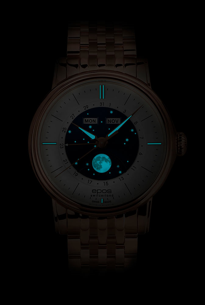 Elegantní Epos 3439 Classic cílí na milovníky hodinek v klasickém stylu. Dobře čitelný stříbrný ciferník s lineárními, plochými indexy a špičatými ručičkami se perfektně hodí. Značky minut a hodin, stejně jako indexy na hlavních hodinách, jsou vyplněny luminiscenční látkou, která svítí ve tmě. Stejná látka se nachází na ručičce data, která po obvodu ukazuje číslo dne v měsíci. Centrální část v barvě noční oblohy zdobí hvězdy a úplně dole je velký efektní měsíc s fázemi měsíce. Všechny tyto prvky se také ve tmě třpytí nádhernou září.