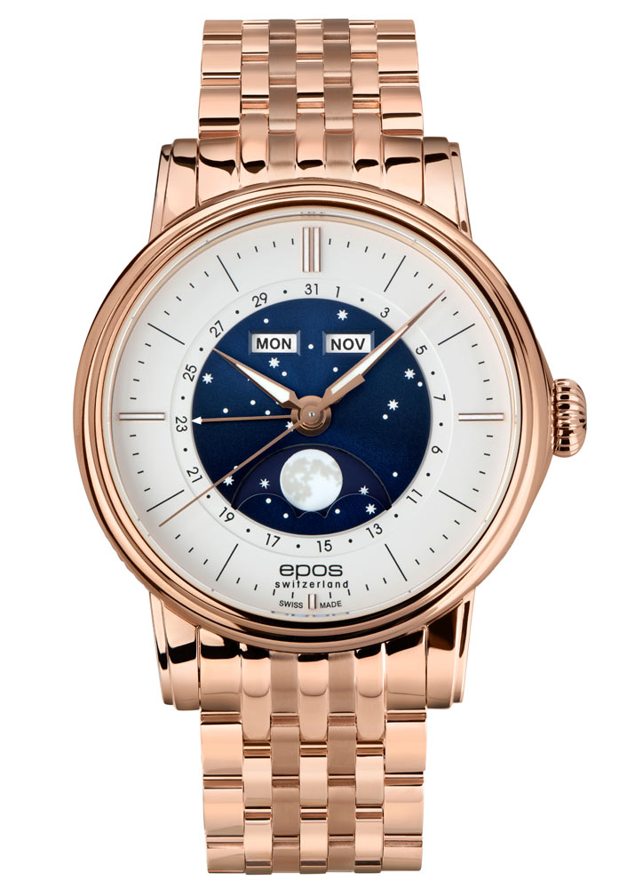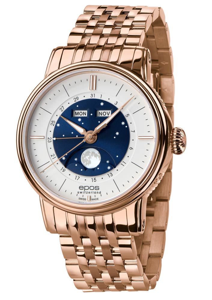Epos Oeuvre D'Art Classic 3439.322.24.18.34 v krásném růžově pozlaceném PVD pouzdru o průměru 41,7 mm . Uvnitř je automatický Machineek Sellita SW300 s modulem Epos Big Moon navrženým inženýry Epos. Machineek je vyroben s důrazem na nejmenší detail a zdoben krásným vzorem Côtes de Genève , který je viditelný přes safírově glazované šroubovací pouzdro. Další funkce, jako je zobrazení dne v týdnu a měsíce, zobrazení data a extra velké zobrazení fáze měsíce, jsou oblíbené funkce většiny nadšenců do hodinek a stále jsou součástí těchto pozoruhodných hodinek.