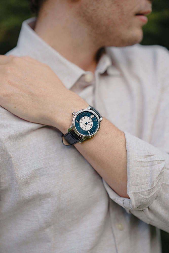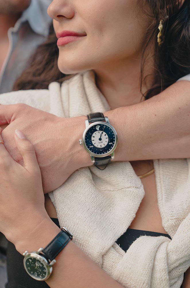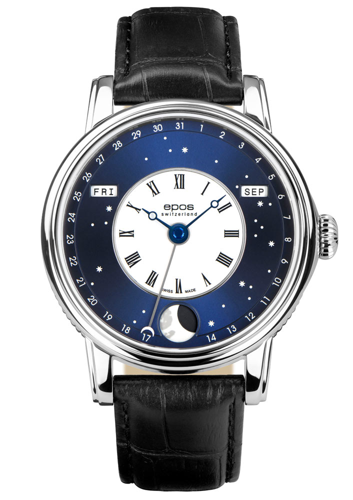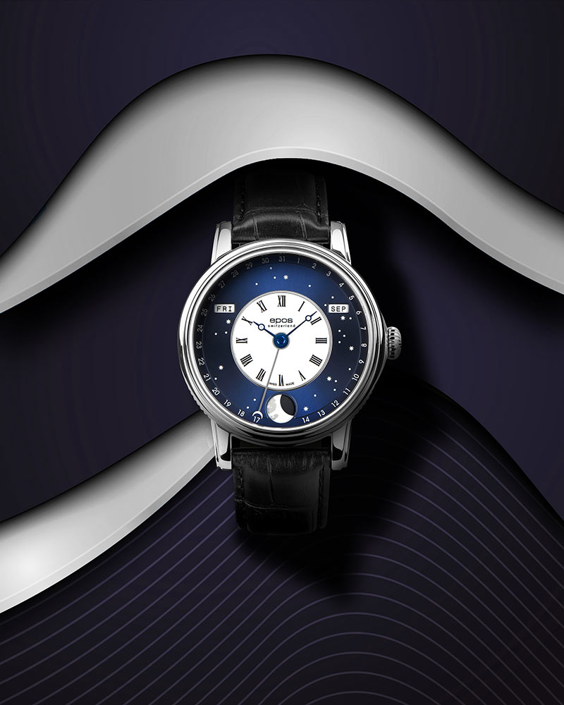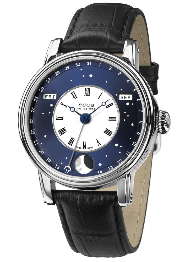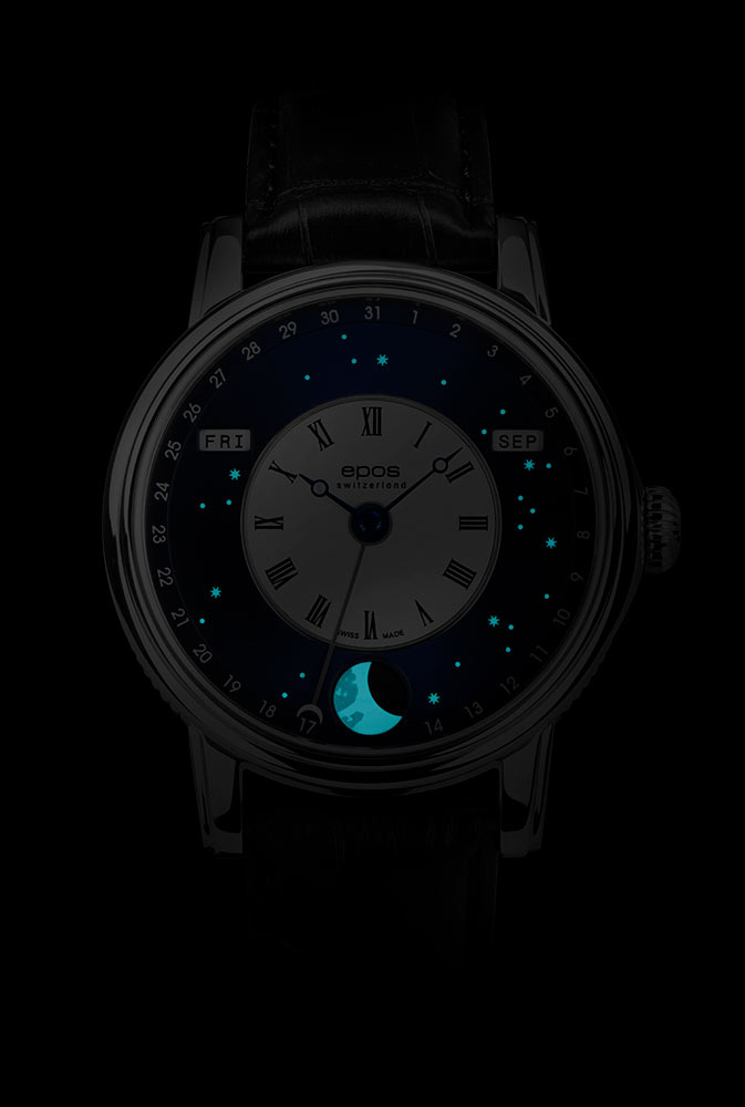 Švýcarská značka Epos rozšiřuje svou kolekci elegantních hodinek s fází měsíce o nové Epos 3439 V-Style . Efektní, exkluzivní vzhled s designem Verso. Toho bylo dosaženo začleněním několika charakteristických prvků z úspěšného vlajkového modelu Epos 3435 Oeuvre D'Art Verso II. Přenesl se zejména bíle lakovaný ciferník s černým logem a římskými číslicemi a modrá hodinová a minutová ručka. Dalším prvkem převzatým z jiného modelu Epos 3439 North Star je nápadný modrý ciferník. Zobrazující noc, hvězdnou oblohu. Kombinací světelného designu noční oblohy s klasickým bílým lakovaným římským centrálním číselníkem vytvořila švýcarská značka Epos mistrovské dílo s dokonalou rovnováhou mezi avantgardou a sofistikovaností.