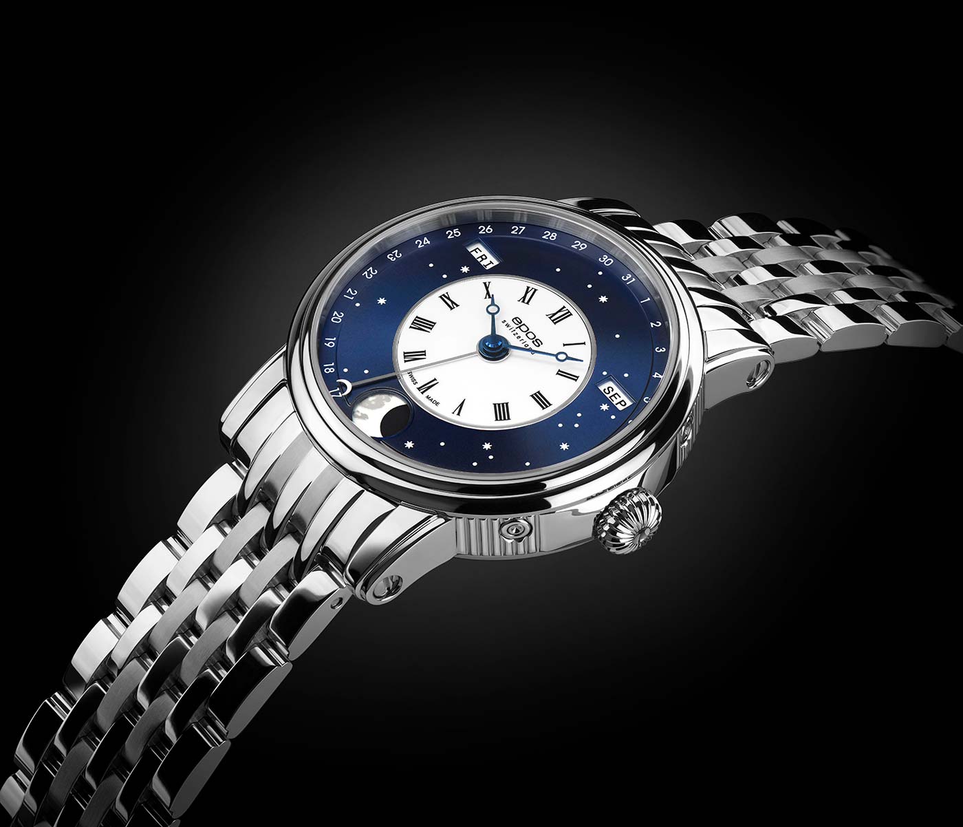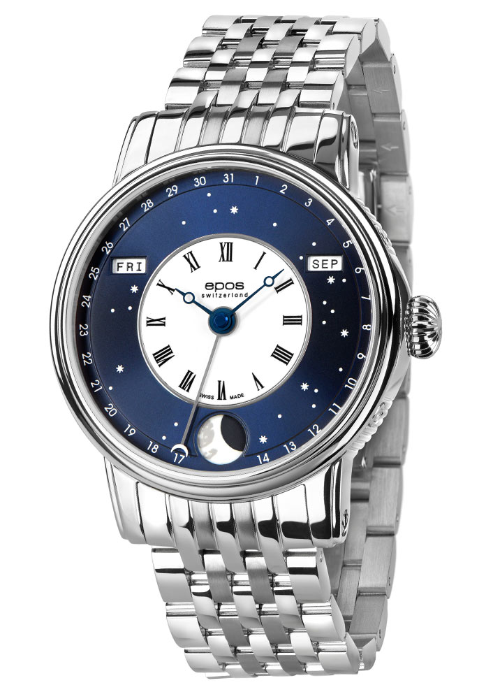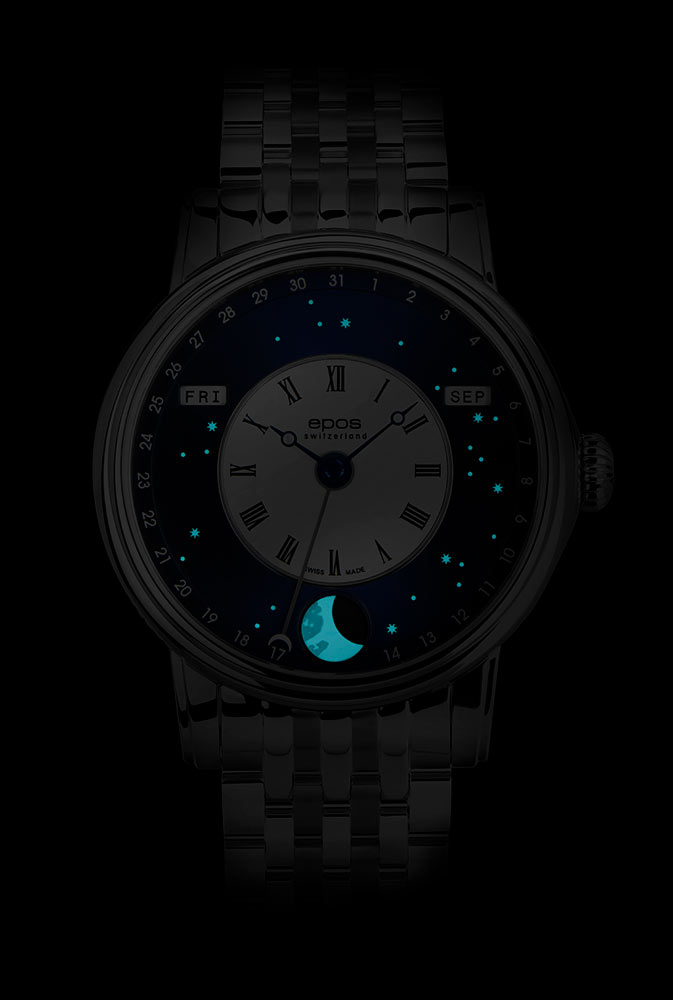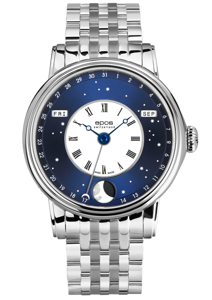 Švýcarská značka Epos rozšiřuje svou kolekci elegantních hodinek s fází měsíce o nové Epos 3439 V-Style . Efektní, exkluzivní vzhled s designem Verso. Toho bylo dosaženo začleněním několika charakteristických prvků z úspěšného vlajkového modelu Epos 3435 Oeuvre D'Art Verso II. Přenesl se zejména bíle lakovaný ciferník s černým logem a římskými číslicemi a modrá hodinová a minutová ručka. Dalším prvkem převzatým z jiného modelu Epos 3439 North Star je nápadný modrý ciferník. Zobrazující noc, hvězdnou oblohu. Kombinací světelného designu noční oblohy s klasickým bílým lakovaným římským centrálním číselníkem vytvořila švýcarská značka Epos mistrovské dílo s dokonalou rovnováhou mezi avantgardou a sofistikovaností.