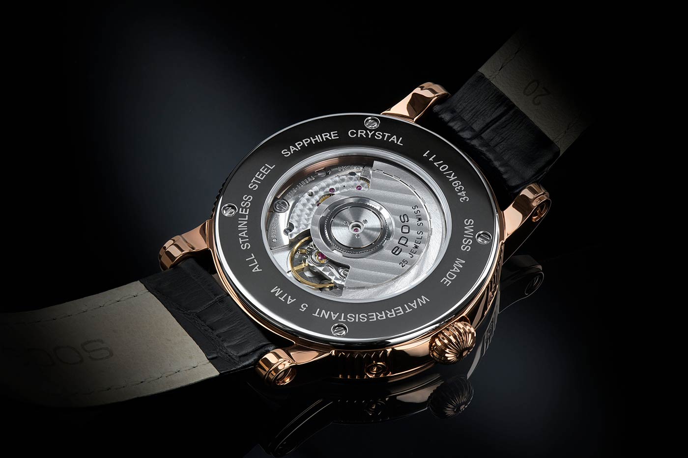 Hodinky Epos Oeuvre D'Art V-Style 3439.322.24.26.25 jsou vybaveny vnitřním modulem Epos Big Moon Module navrženým inženýry Epos. Je spárován s vysoce kvalitním, plně zdobeným, samonatahovacím Machinekem Sellita SW300. Machineek je vyroben s důrazem na nejmenší detail a zdoben krásným vzorem Côtes de Genève , který je viditelný přes safírově glazované šroubovací pouzdro. Další funkce, jako je zobrazení dne v týdnu a měsíce, zobrazení data a extra velké zobrazení fáze měsíce, jsou oblíbené funkce většiny nadšenců do hodinek a stále jsou na těchto pozoruhodných hodinkách. Jsou umístěny po stranách a ve spodní části hvězdně modré lunety ve tvaru písmene V. Hodinky mají pevné pouzdro pozlacené PVD růžovým zlatem o průměru 41,70 mm a tloušťce pouhých 10,70 mm, doplněné o voděodolnost do 5 barů 50 m.