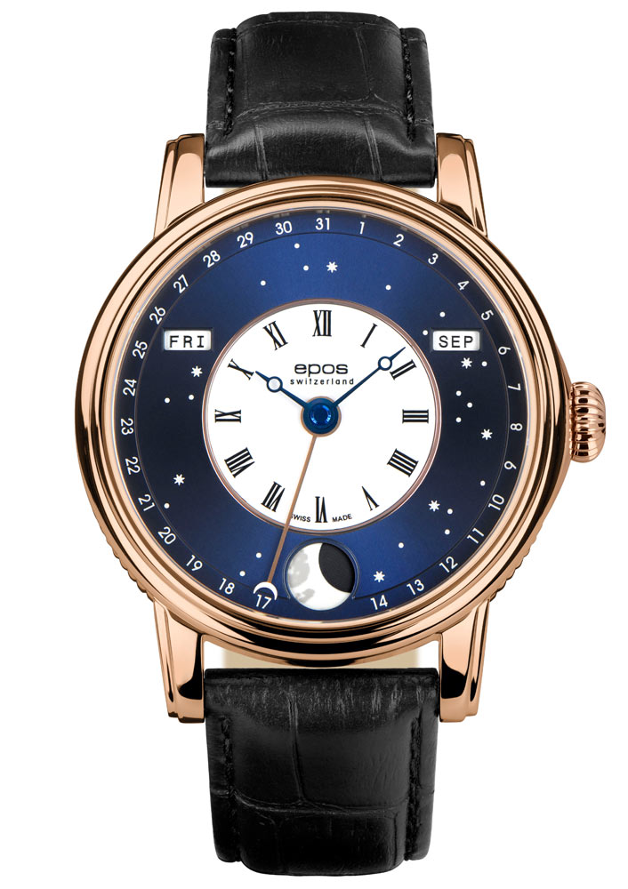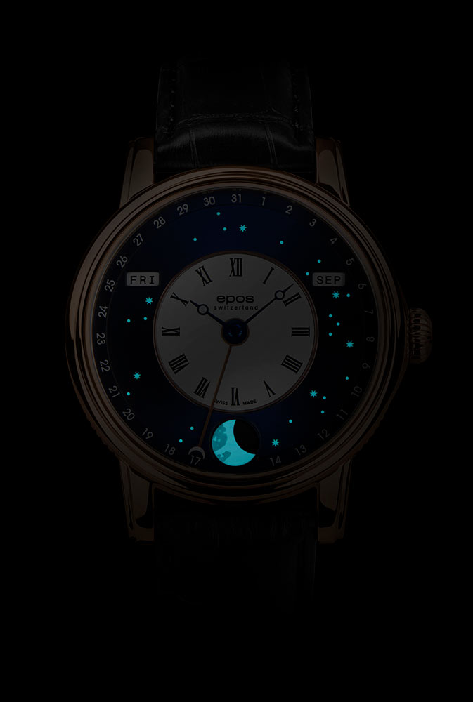 Švýcarská značka Epos rozšiřuje svou kolekci elegantních hodinek s fází měsíce o nové Epos 3439 V-Style . Efektní, exkluzivní vzhled s designem Verso. Toho bylo dosaženo začleněním několika charakteristických prvků z úspěšného vlajkového modelu Epos 3435 Oeuvre D'Art Verso II. Přenesl se zejména bíle lakovaný ciferník s černým logem a římskými číslicemi a modrá hodinová a minutová ručka. Dalším prvkem převzatým z jiného modelu Epos 3439 North Star je nápadný modrý ciferník. Zobrazující noc, hvězdnou oblohu. Kombinací světelného designu noční oblohy s klasickým bílým lakovaným římským centrálním číselníkem vytvořila švýcarská značka Epos mistrovské dílo s dokonalou rovnováhou mezi avantgardou a sofistikovaností.
