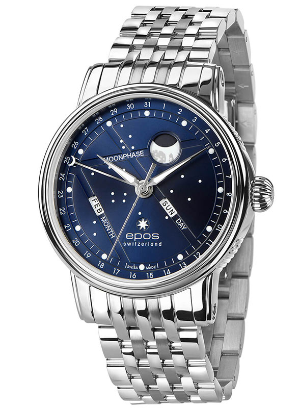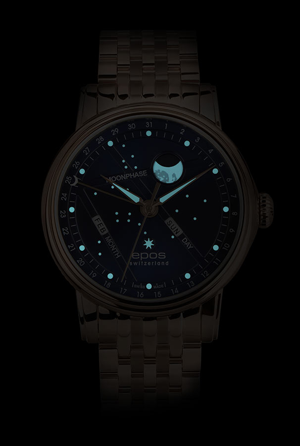 První, co na tomto modelu zaujme, je bezesporu působivý a komplexní ciferník, který díky svému tlumenému odstínu modré (se zářivými odlesky ve stylu Sunrays ) klamně připomíná noční nebeskou kouli. Vizionáři značky Epos se rozhodli vytvořit měřítko času, jehož pozadím bude noční obloha a dokonce i jeho přesná oblast, kterou je souhvězdí Velké medvědice, tedy Malý medvěd. Na ciferníku jsou proto těsně nad logem značky umístěny astronomické komponenty související se souhvězdími, jako je měsíc, nebeská tělesa a Polárka. Všechny tyto prvky jsou spolu s ručičkami a hodinovými indexy obohaceny o luminiscenční látku , díky které může uživatel odečítat čas i po setmění. Grandiózní Měsíc je vnitřní modifikací zařízení a kromě toho, že je zvláštním vizuálním rozptýlením, plní speciální funkci fází Měsíce. Také v neobvyklém podlaží jsou uloženy dvě další funkce: ukazatel dne v týdnu a měsíce. Fenomenální jsou také ručky, jejichž zkosený tvar a postříbřená barva v kombinaci s povrchovou úpravou vteřinové ručky - detailně propracovaným Moonem, dodávají hodinkám velkou eleganci. Ciferník a jeho obsah jsou chráněny nejkvalitnějším safírovým sklem s antireflexní vrstvou . Toto sklo se vyznačuje silnou odolností proti poškrábání a průhledností rovnající se hvězdnému světlu. Ciferník je uložen v ocelovém pouzdře stříbrné barvy o průměru 41,7 mm se zkosenou korunkou s logem Epos. Jeho oválný tvar je odkazem na tradici a zároveň je elegantním rozlišením a komfortem při používání. Navíc to usnadňuje uchopení takové korunky pro nastavení času.