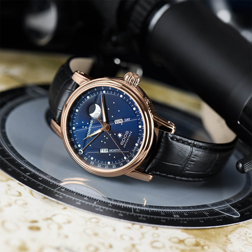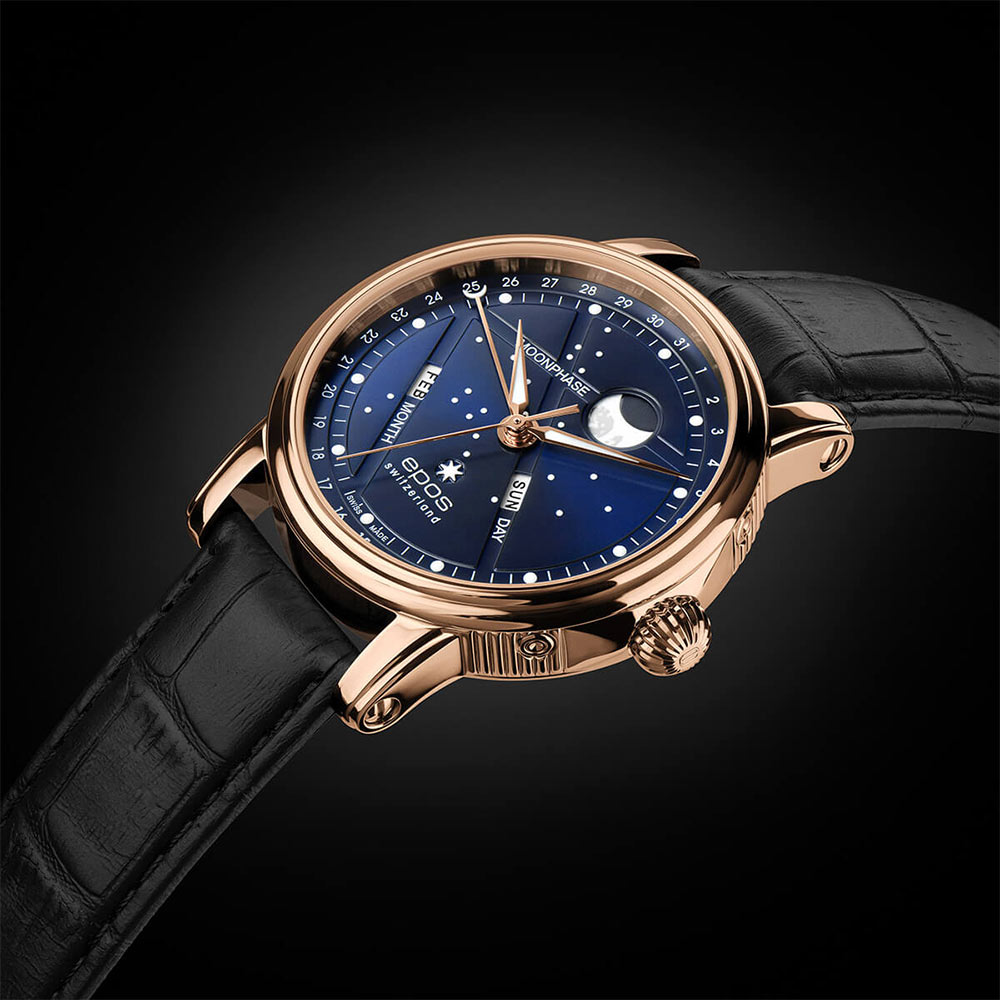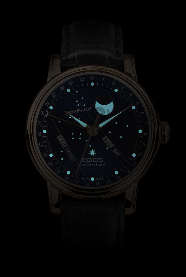 První, co na tomto modelu zaujme, je bezesporu působivý a komplexní ciferník, který díky svému tlumenému odstínu modré (se zářivými odlesky ve stylu Sunrays ) klamně připomíná noční nebeskou kouli. Vizionáři značky Epos se rozhodli vytvořit měřítko času, jehož pozadím bude noční obloha a dokonce i jeho přesná oblast, kterou je souhvězdí Velké medvědice, tedy Malý medvěd. Na ciferníku jsou tedy astronomické komponenty patřící do souhvězdí, jako je měsíc, nebeská tělesa a severní hvězda – těsně nad logem značky. Všechny tyto prvky jsou spolu s ručičkami a hodinovými indexy obohaceny o luminiscenční látku , díky které může uživatel odečítat čas i po setmění. Grandiózní Měsíc je vnitřní modifikací zařízení a kromě toho, že je zvláštním vizuálním rozptýlením, plní speciální funkci fází Měsíce. Také v neobvyklém podlaží jsou uloženy dvě další funkce: ukazatel dne v týdnu a měsíce. Fenomenální jsou také ručky, jejichž zkosený tvar a pozlacená barva v kombinaci s povrchovou úpravou vteřinové ručičky - detailním Moonem, dodávají hodinkám velkou eleganci. Ciferník a jeho obsah jsou chráněny nejkvalitnějším safírovým sklem s antireflexní vrstvou . Toto sklo se vyznačuje silnou odolností proti poškrábání a průhledností rovnající se hvězdnému světlu. Ciferník je uložen v ocelovém pouzdře 41,7 mm v růžovém zlatě ( potažené PVD ) se zkosenou korunkou s logem Epos. Jeho oválný tvar je odkazem na tradici a zároveň je elegantním rozlišením a komfortem při používání. Navíc to usnadňuje uchopení takové korunky pro nastavení času.