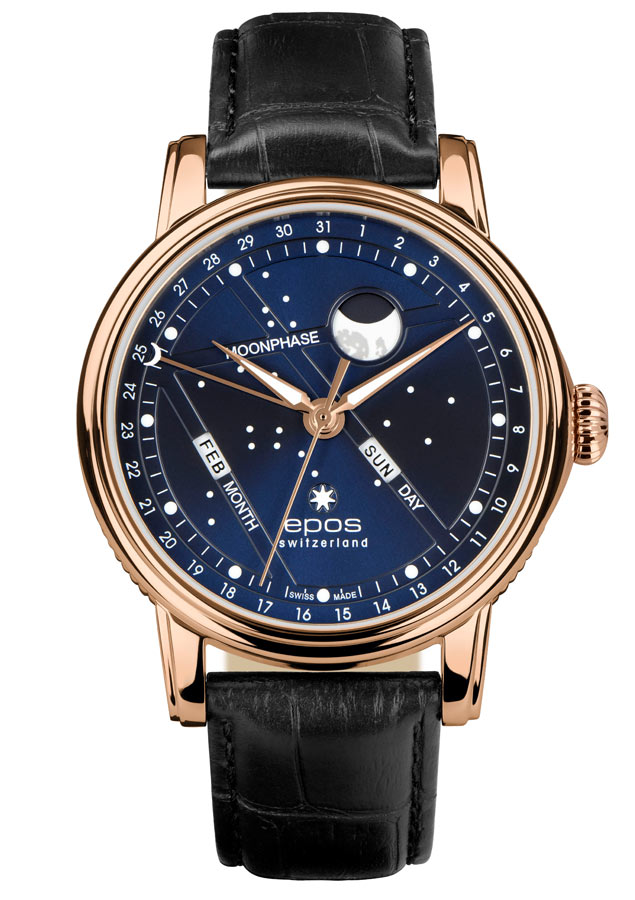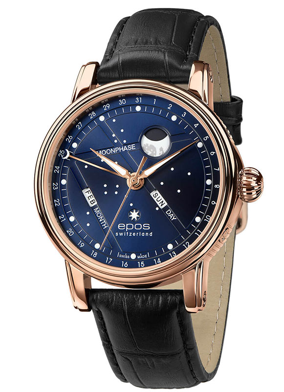 Švýcarští řemeslníci EPOS si díky mnohaleté praxi vydobyli pověst hodinářských průkopníků, což se promítá do dokonalé preciznosti a estetiky viditelné v nejmenších detailech povrchové úpravy. Výrobce neváhá ukázat, jak vypadá mechanismus, který je srdcem hodinek. U tohoto modelu lze jeho práci obdivovat skrz průhledná zadní strana pouzdra. Na povrch rotoru byl aplikován složitý perlační vzor. Dalším stylovým prvkem hodinek je černý kožený řemínek s klasickou sponou. Pohyb modelu hodinek ETA 2892 je plně automatický a činnost jeho práce je určována pohybem ruky při každodenním používání.