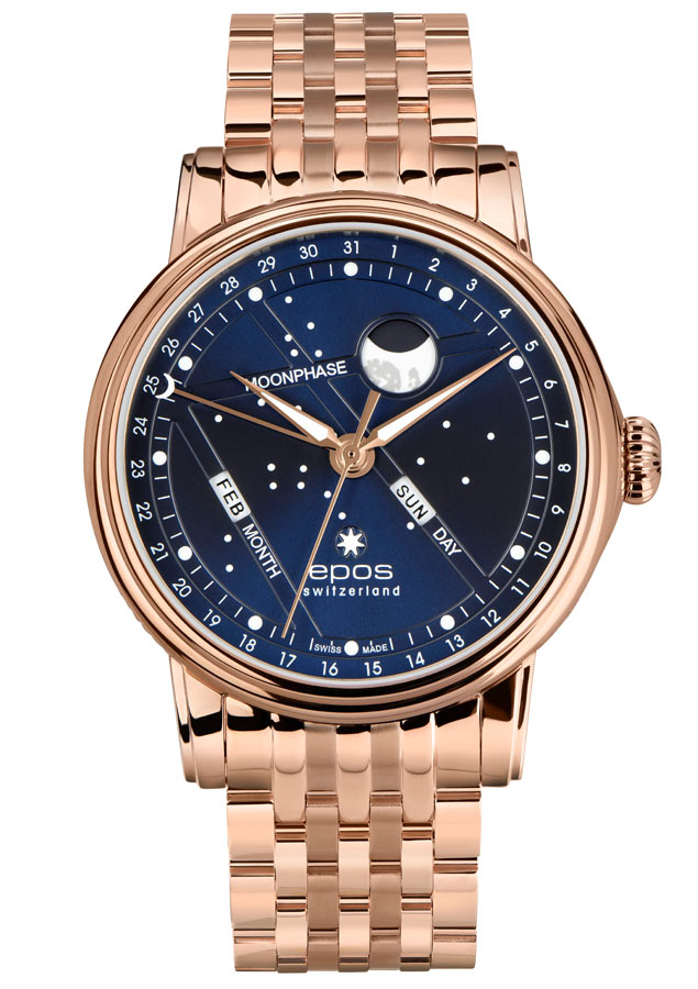 První, co na tomto modelu zaujme, je bezesporu působivý a komplexní ciferník, který díky svému tlumenému odstínu modré (se zářivými odlesky ve stylu Sunrays ) klamně připomíná noční nebeskou kouli. Vizionáři značky Epos se rozhodli vytvořit měřítko času, jehož pozadím bude noční obloha a dokonce i jeho přesná oblast, kterou je souhvězdí Velké medvědice, tedy Malý medvěd. Na ciferníku jsou tedy astronomické komponenty patřící do souhvězdí, jako je měsíc, nebeská tělesa a severní hvězda – těsně nad logem značky. Všechny tyto prvky jsou spolu s ručičkami a hodinovými indexy obohaceny o luminiscenční látku , díky které může uživatel odečítat čas i po setmění. Grandiózní Měsíc je vnitřní modifikací zařízení a kromě toho, že je zvláštním vizuálním rozptýlením, plní speciální funkci fází Měsíce. Také v neobvyklém podlaží jsou uloženy dvě další funkce: ukazatel dne v týdnu a měsíce. Fenomenální jsou také ručky, jejichž zkosený tvar a pozlacená barva v kombinaci s povrchovou úpravou vteřinové ručičky - detailním Moonem, dodávají hodinkám velkou eleganci. Ciferník a jeho obsah jsou chráněny nejkvalitnějším safírovým sklem s antireflexní vrstvou . Toto sklo se vyznačuje silnou odolností proti poškrábání a průhledností rovnající se hvězdnému světlu. Ciferník je zapouzdřen v 41,7 mm pozlaceném ocelovém pouzdře ( ROSE GOLD PVD povlak ) se zkosenou korunkou s logem Epos. Jeho oválný tvar je odkazem na tradici a zároveň je elegantním rozlišením a komfortem při používání. Navíc to usnadňuje uchopení takové korunky pro nastavení času.