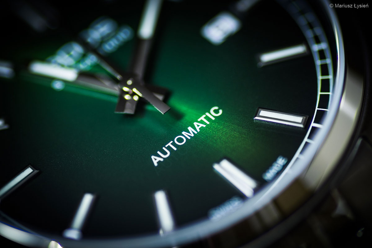 Tento luxusní Machine, vytvořený v soukromí švýcarských dílen, vypadá díky barevné kombinaci velmi efektně a podmanivě. Skládají se z: černého koženého řemínku se zapínáním na přezku, pevného pouzdra z odolné nerezové oceli, jehož specifičnost jej ochrání před rzí a zároveň účinně a dlouhodobě odolává efektu zašpinění, a sytě zelené sluneční paprsky ciferník. Tento lesk je velkým vizuálním přínosem hodinek díky svým zářivým odleskům zeleného světla viditelným na okrajích ciferníku v závislosti na úhlu pohledu. Takový ciferník je chráněn špičkovým safírovým sklíčkem odolným proti poškrábání a velmi průhledný. Pečlivě a ručně aplikované čárkovité hodinové indexy a ručičky zase nejen stylově ladí s celou podstatou hodinek, ale mají i cennou funkční přednost, kterou je jejich potažení luminiscenční látkou . Tato látka rozšiřuje možnosti uživatele a umožňuje odečítat čas i po setmění. Pozoruhodná je také stříbrná krajka s logem značky. Za svůj sofistikovaný vzhled vděčí zkosení a leštěným a ručně rýhovaným hranám.