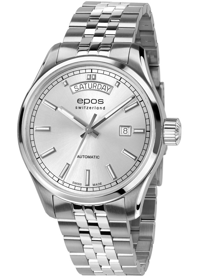 EPOS 3501 Day Date pohání krásně zdobený a samonatahovací Machineek Sellita SW240 . Přes zadní stranu pouzdra, zasklenou minerálním sklem, je vidět švýcarský Machineek. Oblíbené 41mm pouzdro Epos Passion je perfektní pouzdro na pánské zápěstí. Zdobeno leštěným prstenem a leštěnými okraji. Kromě zobrazení data ve 12 a 3 hodiny jsou tyto vysoce kvalitní hodinky voděodolné do 100 m 10 bar a safírové sklíčko odolné proti poškrábání je nedílnou součástí standardu kvality EPOS. Stříbrný ciferník s krásným slunečním ornamentem, který šíří světlo od středu k okrajům ciferníku.