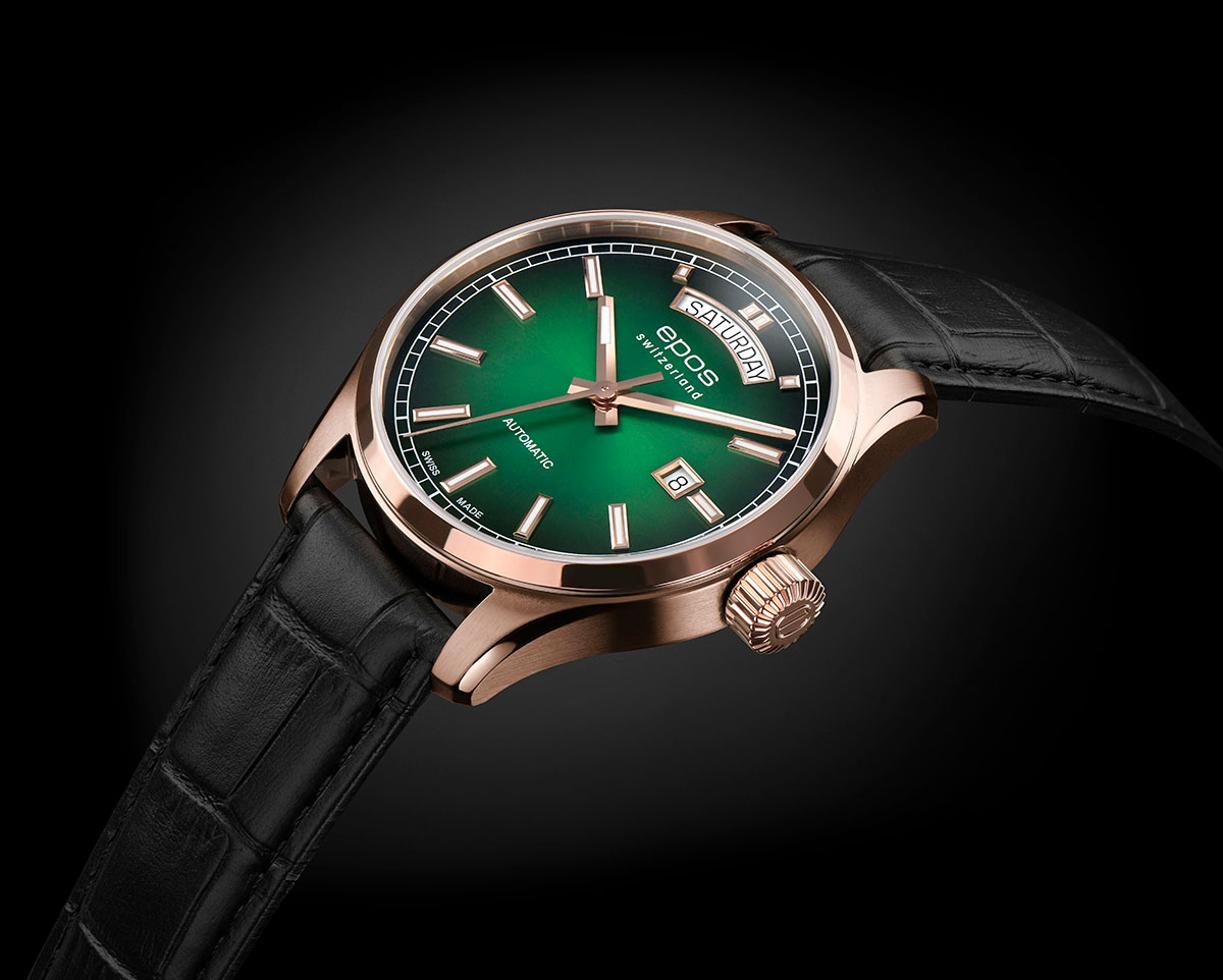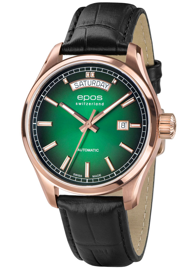 EPOS 3501 Day Date pohání krásně zdobený a samonatahovací Machineek Sellita SW240 . Přes zadní stranu pouzdra, zasklenou minerálním sklem, je vidět švýcarský Machineek. Oblíbené 41mm pouzdro Epos Passion je perfektní pouzdro na pánské zápěstí. Zdobený leštěným prstenem a leštěnými okraji, pokrytý PVD povlakem z růžového zlata. Kromě zobrazení data ve 12 a 3 hodiny jsou tyto vysoce kvalitní hodinky voděodolné do 100 m 10 bar a safírové sklíčko odolné proti poškrábání je nedílnou součástí standardu kvality EPOS. Zelený ciferník s krásnými přechody je navíc ozdoben sunburstem, který šíří světlo od středu k okrajům ciferníku.