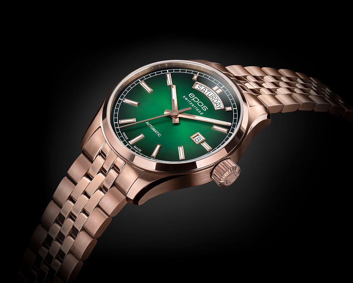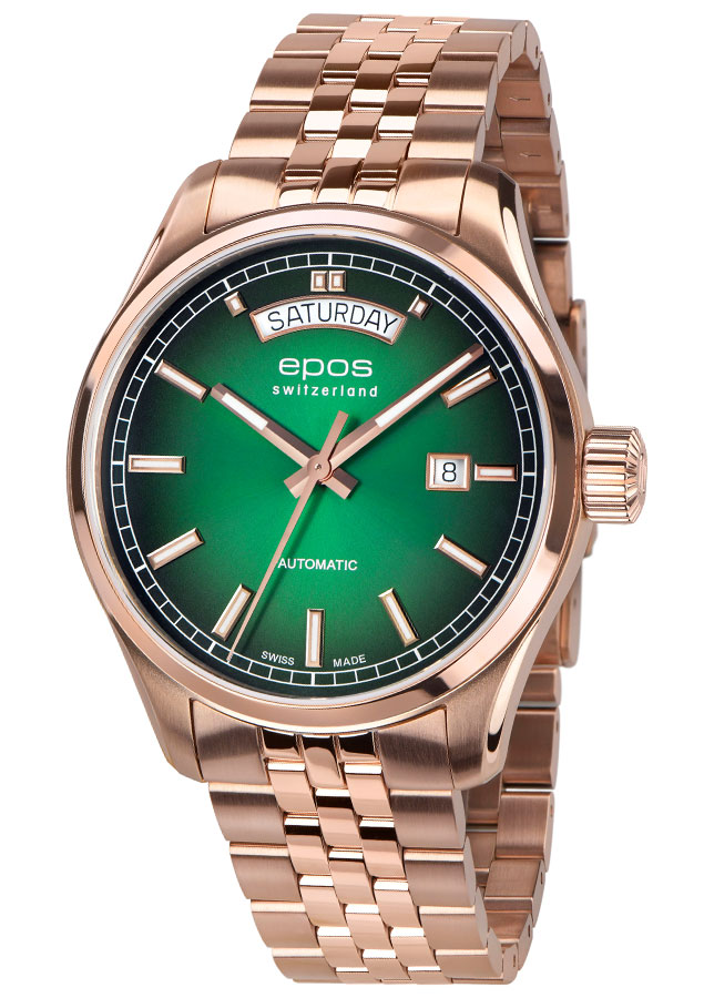 EPOS 3501 Day Date pohání krásně zdobený a samonatahovací Machineek Sellita SW240 . Přes zadní stranu pouzdra, zasklenou minerálním sklem, je vidět švýcarský Machineek. Oblíbené 41mm pouzdro Epos Passion je perfektní pouzdro na pánské zápěstí. Zdobený leštěným prstenem a leštěnými okraji, pokrytý PVD povlakem z růžového zlata. Kromě zobrazení data ve 12 a 3 hodiny jsou tyto vysoce kvalitní hodinky voděodolné do 100 m 10 bar a safírové sklíčko odolné proti poškrábání je nedílnou součástí standardu kvality EPOS. Zelený ciferník s krásnými přechody je navíc ozdoben sunburstem, který šíří světlo od středu k okrajům ciferníku.