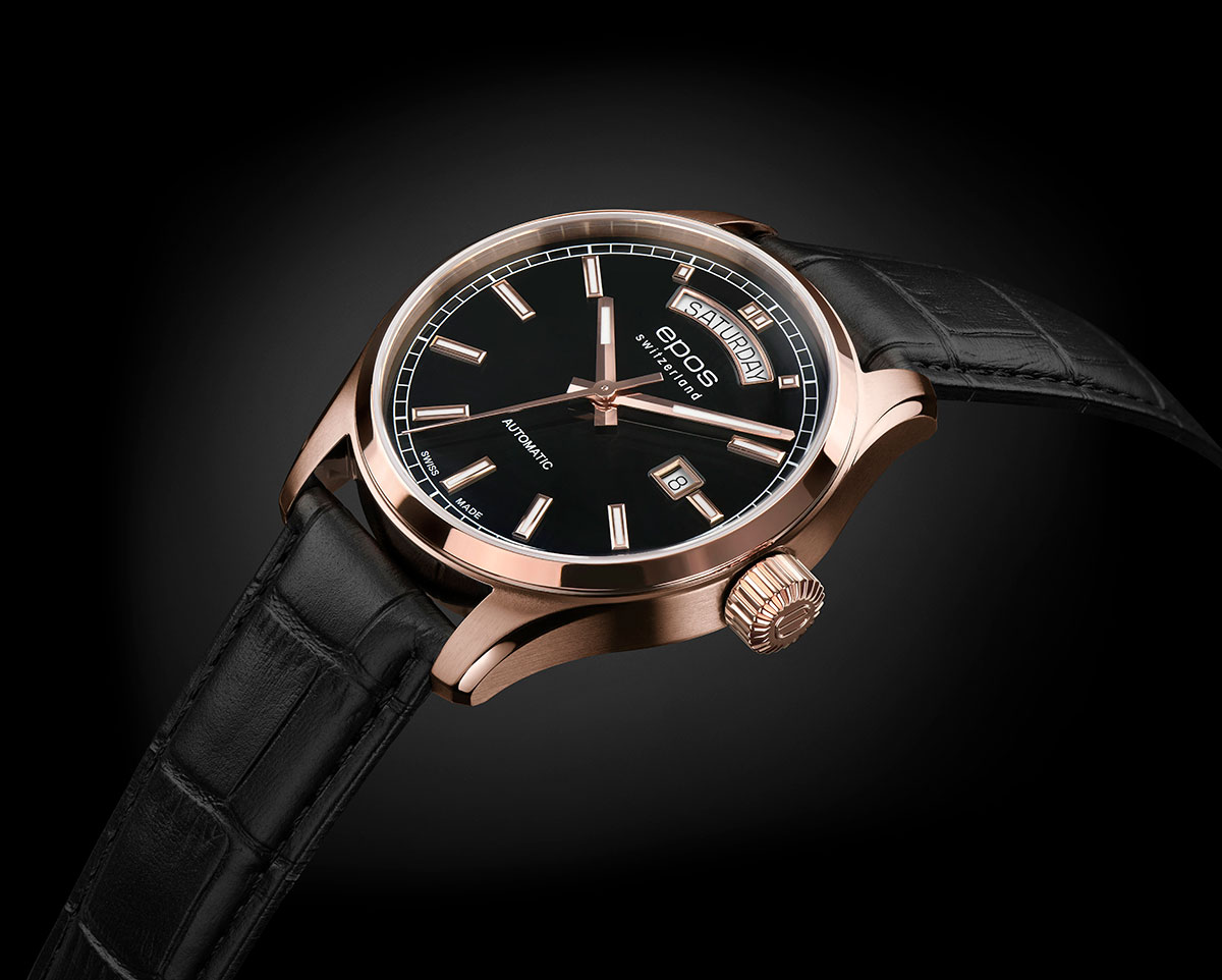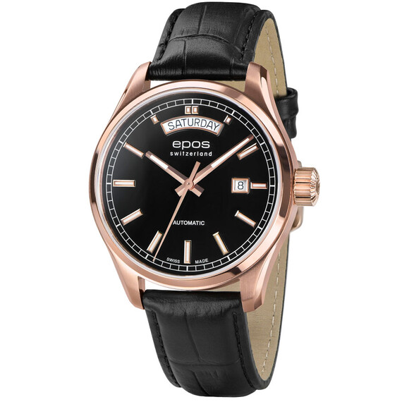 EPOS 3501 Day Date pohání krásně zdobený a samonatahovací Machineek Sellita SW240 . Přes zadní stranu pouzdra, zasklenou minerálním sklem, je vidět švýcarský Machineek. Oblíbené 41mm pouzdro Epos Passion je perfektní pouzdro na pánské zápěstí. Zdobený leštěným prstenem a leštěnými okraji, pokrytý PVD povlakem z růžového zlata. Kromě zobrazení data ve 12 a 3 hodiny jsou tyto vysoce kvalitní hodinky voděodolné do 100 m 10 bar a safírové sklíčko odolné proti poškrábání je nedílnou součástí standardu kvality EPOS. Černý ciferník je lakovaný, zdobený lineárními indexy, které jsou vyplněny luminiscenční hmotou. Stejný svítící motiv najdeme i na rukou.