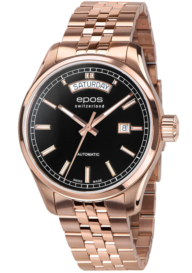 EPOS 3501 Day Date pohání krásně zdobený a samonatahovací Machineek Sellita SW240 . Přes zadní stranu pouzdra, zasklenou minerálním sklem, je vidět švýcarský Machineek. Oblíbené 41mm pouzdro Epos Passion je perfektní pouzdro na pánské zápěstí. Zdobený leštěným prstenem a leštěnými okraji, pokrytý PVD povlakem z růžového zlata. Kromě zobrazení data ve 12 a 3 hodiny jsou tyto vysoce kvalitní hodinky voděodolné do 100 m 10 bar a safírové sklíčko odolné proti poškrábání je nedílnou součástí standardu kvality EPOS. Černý ciferník je lakovaný, zdobený lineárními indexy, které jsou vyplněny luminiscenční hmotou. Stejný svítící motiv najdeme i na rukou.
