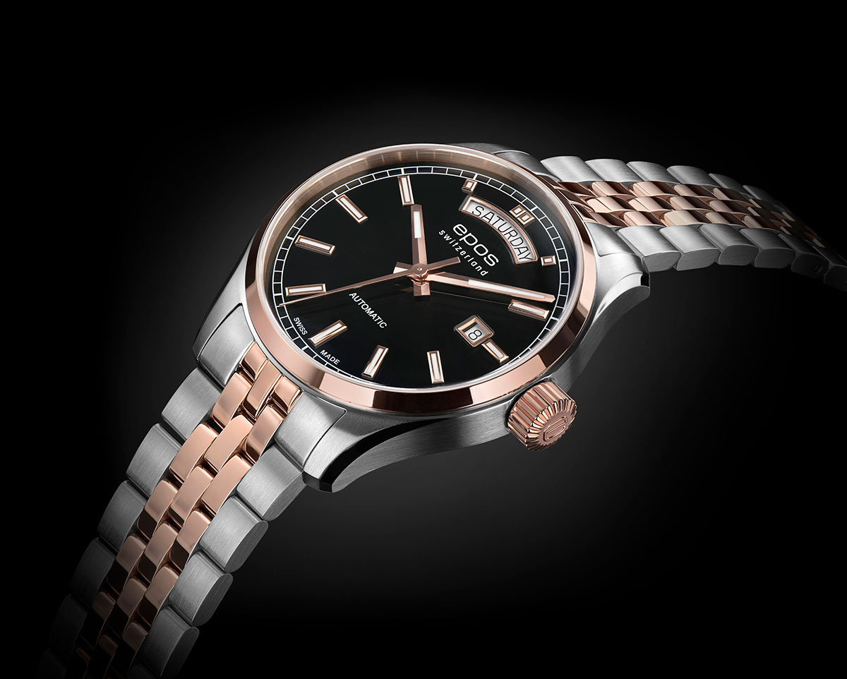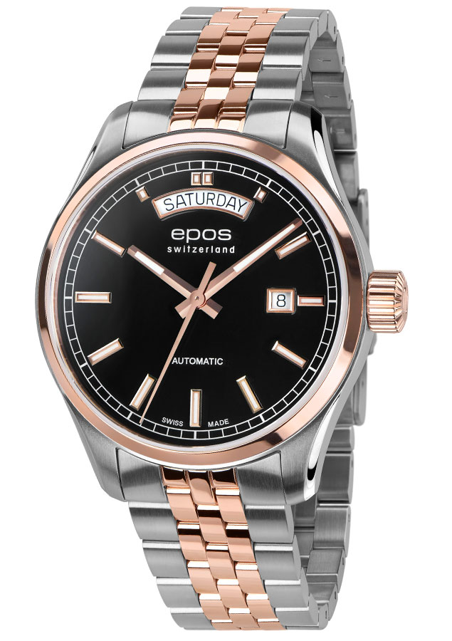 EPOS 3501 Day Date pohání krásně zpracovaný automatický Machineek Sellita SW240 . Přes zadní stranu pouzdra, zasklenou minerálním sklem, je vidět švýcarský Machineek. Oblíbené 41mm pouzdro Epos Passion je perfektní pouzdro na pánské zápěstí. Zdobený leštěným prstenem pozlaceným PVD růžovým zlatem a leštěnými okraji. Kromě zobrazení data ve 12 a 3 hodiny jsou tyto vysoce kvalitní hodinky voděodolné do 100 m 10 bar a safírové sklíčko odolné proti poškrábání je nedílnou součástí standardu kvality EPOS. Černý ciferník je lakovaný, zdobený lineárními indexy, které jsou vyplněny luminiscenční hmotou. Stejný svítící motiv najdeme i na rukou. Díky odnímatelným článkům se dá přizpůsobit jakémukoli zápěstí.