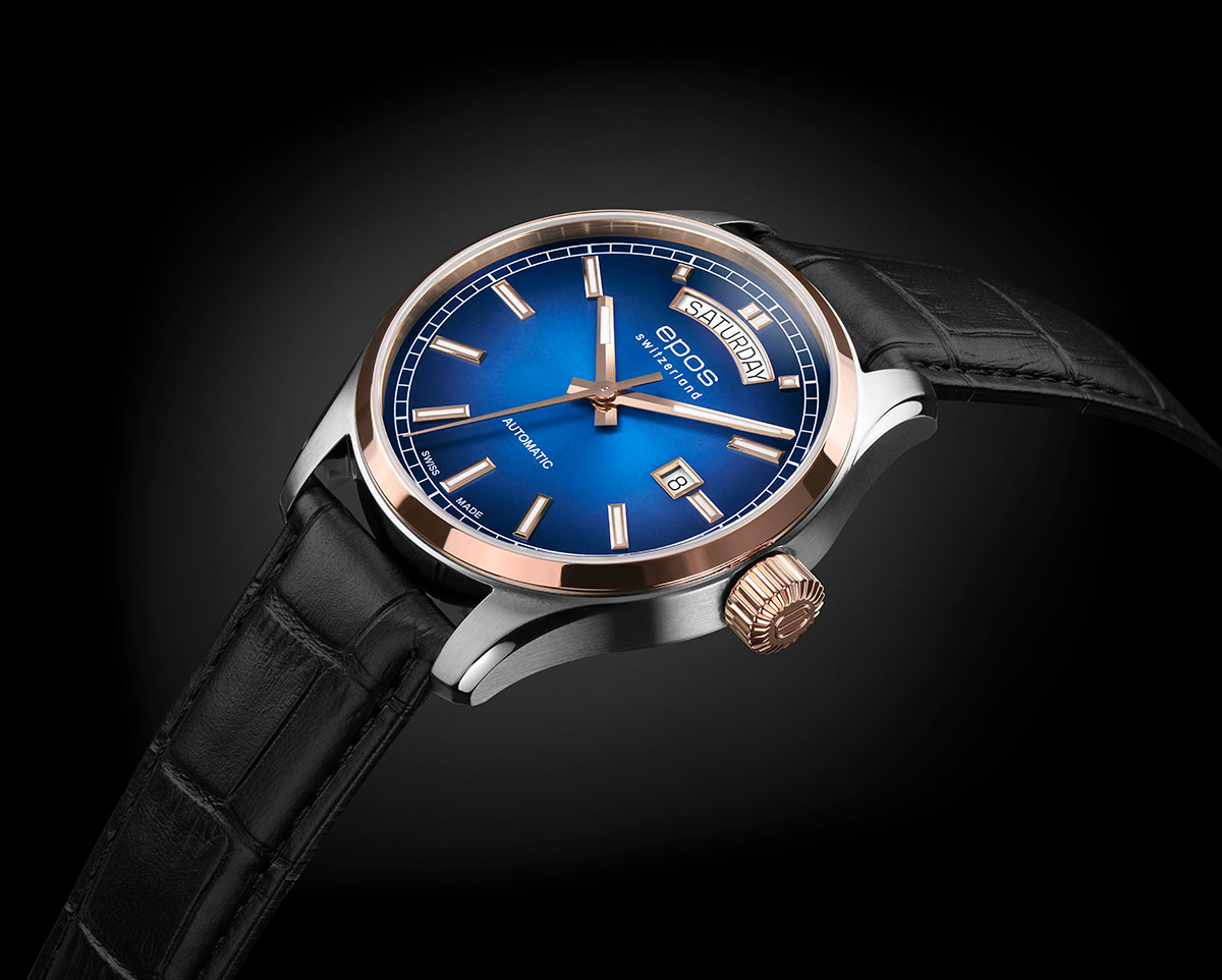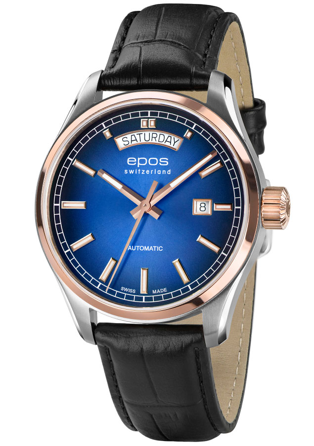 EPOS 3501 Day Date pohání krásně zpracovaný automatický Machineek Sellita SW240 . Přes zadní stranu pouzdra, zasklenou minerálním sklem, je vidět švýcarský Machineek. Oblíbené 41mm pouzdro Epos Passion je perfektní pouzdro na pánské zápěstí. Zdobený leštěným prstenem pozlaceným PVD růžovým zlatem a leštěnými okraji. Kromě zobrazení data ve 12 a 3 hodiny jsou tyto vysoce kvalitní hodinky voděodolné do 100 m 10 bar a safírové sklíčko odolné proti poškrábání je nedílnou součástí standardu kvality EPOS. Modrý gradientní ciferník je dále ozdoben povrchovou úpravou sunburst, která šíří světlo od středu k okrajům ciferníku. Design doplňuje elegantní černý kožený řemínek z aligátora.
