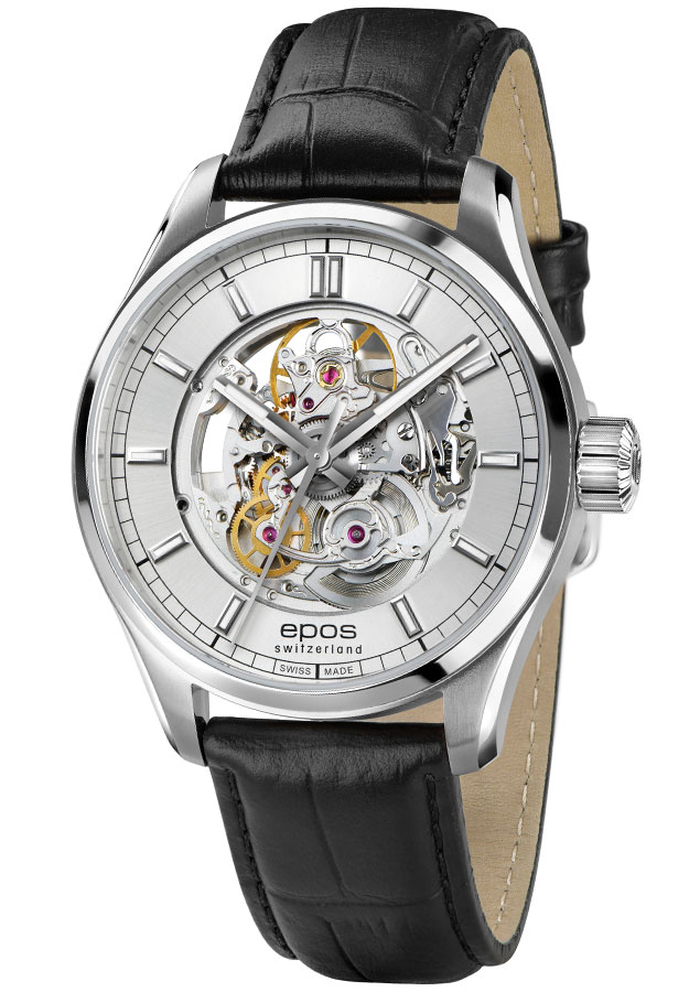 EPOS 3501 SK je vybaven známým a plně skeletovým automatickým Machinekem SW200, s krásnými rytinami a speciálně broušeným a zdobeným rotorem. Zadní strana pouzdra, šroubovaná a glazovaná minerálním sklem, umožňuje obdivovat úžasně zdobený mechanismus. Pozoruhodná voděodolnost do 100 metrů 10 barů. Zářivý stříbrný ciferník s lineárními indexy, které jsou vyplněny luminiscenční látkou, stejně jako hodinová a minutová ručka. Elegantní klasický design se bude dokonale hodit ke košili nebo obleku a ohromující povrchová úprava skeletu uspokojí každého milovníka hodinářství.