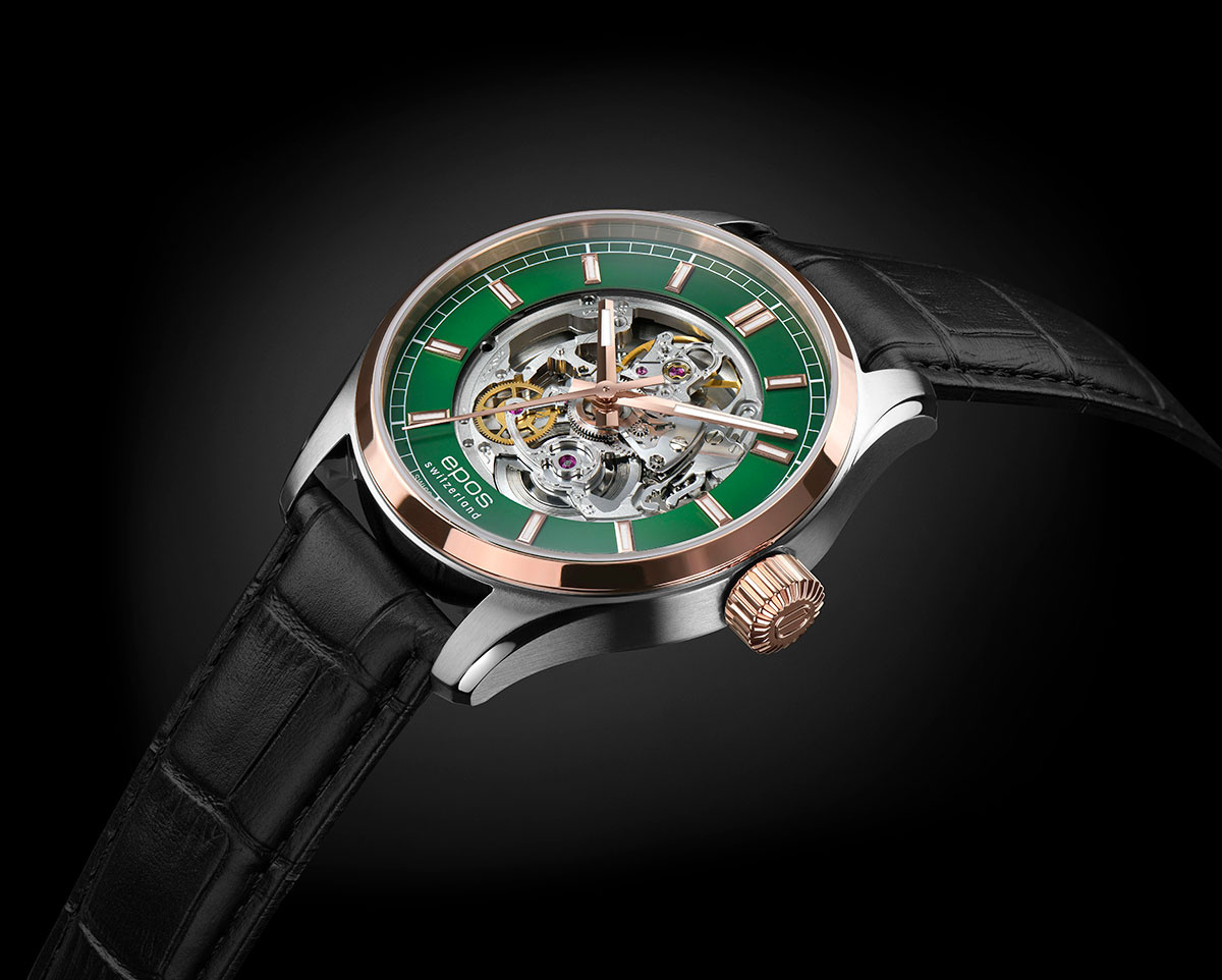 EPOS 3501 SK je vybaven známým a plně skeletovým automatickým Machinekem SW200, s krásnými rytinami a speciálně broušeným a zdobeným rotorem. Zadní strana pouzdra, šroubovaná a glazovaná minerálním sklem, umožňuje obdivovat úžasně zdobený mechanismus. Pozoruhodná voděodolnost do 100 metrů 10 barů. Zářivě zelený ciferník s lineárními indexy, které jsou vyplněny luminiscenční látkou, stejně jako hodinová a minutová ručka. Elegantní klasický design se bude dokonale hodit ke košili nebo obleku a ohromující povrchová úprava skeletu uspokojí každého milovníka hodinářství.