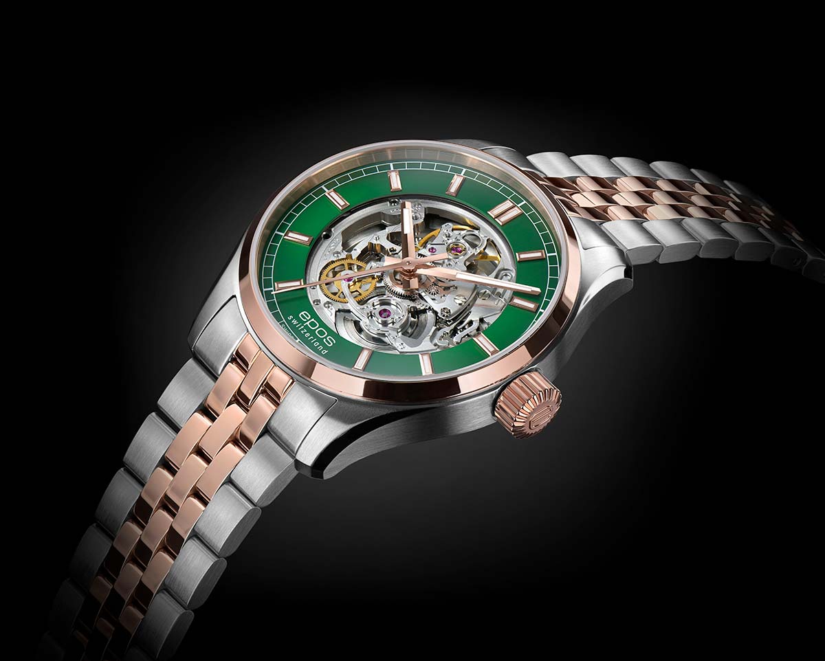 EPOS 3501 SK je vybaven známým a plně skeletovým automatickým Machinekem SW200, s krásnými rytinami a speciálně broušeným a zdobeným rotorem. Zadní strana pouzdra, šroubovaná a glazovaná minerálním sklem, umožňuje obdivovat úžasně zdobený mechanismus. Pozoruhodná voděodolnost do 100 metrů 10 barů. Zářivě zelený ciferník s lineárními indexy, které jsou vyplněny luminiscenční látkou, stejně jako hodinová a minutová ručka. Elegantní klasický design se bude dokonale hodit ke košili nebo obleku a ohromující povrchová úprava skeletu uspokojí každého milovníka hodinářství.