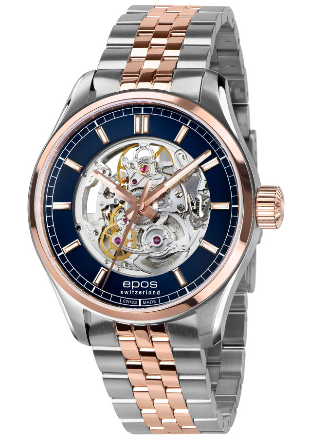 EPOS 3501 SK je vybaven známým a plně skeletovým automatickým Machinekem SW200, s krásnými rytinami a speciálně broušeným a zdobeným rotorem. Zadní strana pouzdra, šroubovaná a glazovaná minerálním sklem, umožňuje obdivovat úžasně zdobený mechanismus. Pozoruhodná voděodolnost do 100 metrů 10 barů. Zářivě modrý ciferník s lineárními indexy, které jsou vyplněny luminiscenční látkou, stejně jako hodinová a minutová ručka. Elegantní klasický design se bude dokonale hodit ke košili nebo obleku a ohromující povrchová úprava skeletu uspokojí každého milovníka hodinářství.
