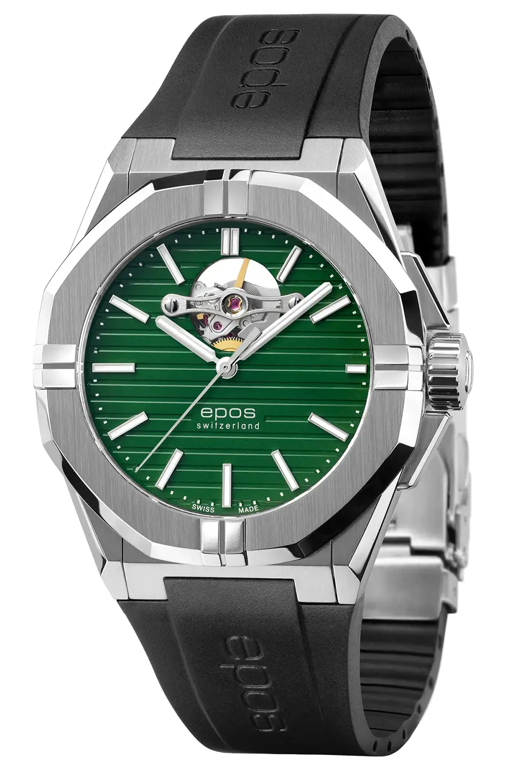 Epos Sport Open Heart 3506.133.20.13.55 to pánské hodinky s moderním, dynamickým charakterem, které se vyznačují zeleným ciferníkem a viditelnou prací automatického mechanismu. Model ze série Sport přitahuje pozornost výrazným stylem, který se skvěle hodí jak pro každodenní nošení, tak pro aktivnější situace.