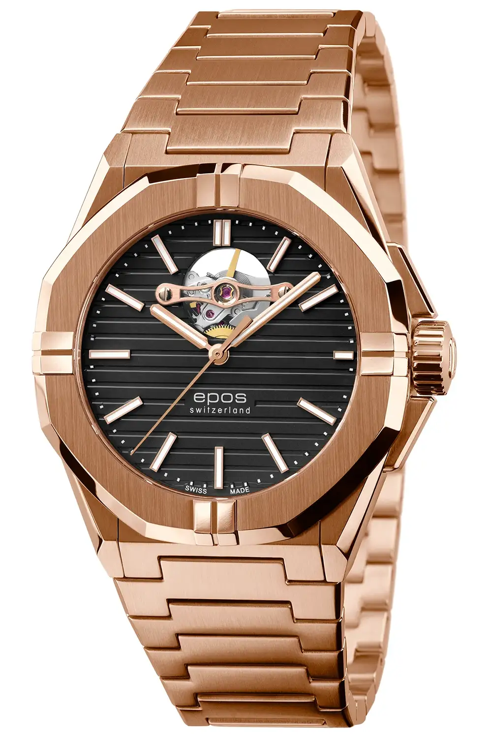 Pouzdro o průměru 41 mm je pokryto odolnou povrchovou úpravou PVD v odstínu růžového zlata. Toto pokročilé provedení se vyznačuje vysokou odolností a hlubokou, sytou barvou, která hodinkám dodává prestižní charakter. Ocelový náramek ve stejné tonaci podtrhuje celkovou soudržnost designu. Černý ciferník s lineární strukturou dodává celku výraznost a otevřené srdce hodinek na pozici 12. hodiny umožňuje sledovat činnost setrvačníku – prvek, který tuto linii odlišuje od klasických sportovních modelů.