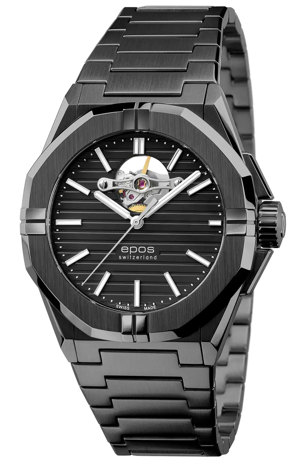 Epos Sport Open Heart 3506.133.25.15.35 je pánské automatické hodinky navržené pro ty, kteří hledají moderní technický styl v jednotné, hluboce černé barevnosti. Model se vyznačuje kompaktní estetikou, kde se sportovní linie pouzdra spojují s elegancí tmavé oceli a viditelnou prací mechanismu.