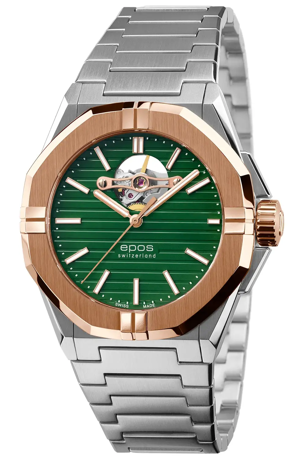 Epos Sport Open Heart 3506.133.34.13.30 jsou pánské automatické hodinky, které spojují moderní styl s elegantní dvoubarevnou estetikou. Zelený ciferník v kombinaci s ušlechtilou ocelí a růžovým zlatem vytváří výjimečně vyváženou kompozici, zdůrazňující charakter kolekce Sport.