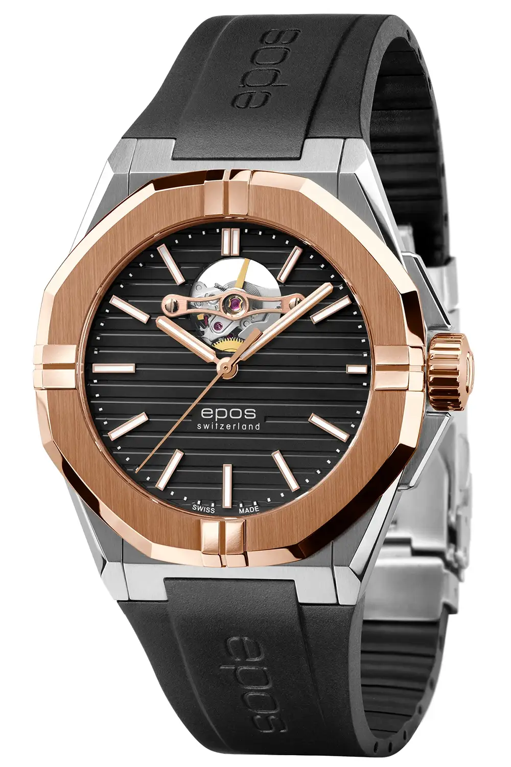 Epos Sport Open Heart 3506.133.34.15.55 je pánské automatické hodinky, které spojují moderní sportovní styl s elegantní dvoubarevnou konstrukcí. Černý ciferník kontrastuje s akcenty růžového zlata a vytváří vyvážený, dynamický vzhled podtržený okénkem Open Heart na pozici 12.
