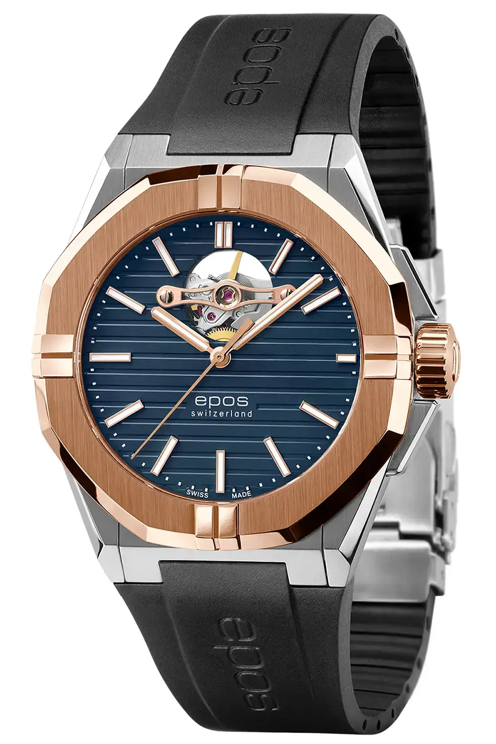 Epos Sport Open Heart 3506.133.34.16.55 je pánské automatické hodinky, které spojují sportovní formu s elegantním dvoubarevným stylem. Intenzivně modrý ciferník v kombinaci s akcenty růžového zlata dodává tomuto modelu svěžest a charakter, zatímco okénko Open Heart odhaluje srdce mechanismu a zdůrazňuje jeho hodinářskou povahu.