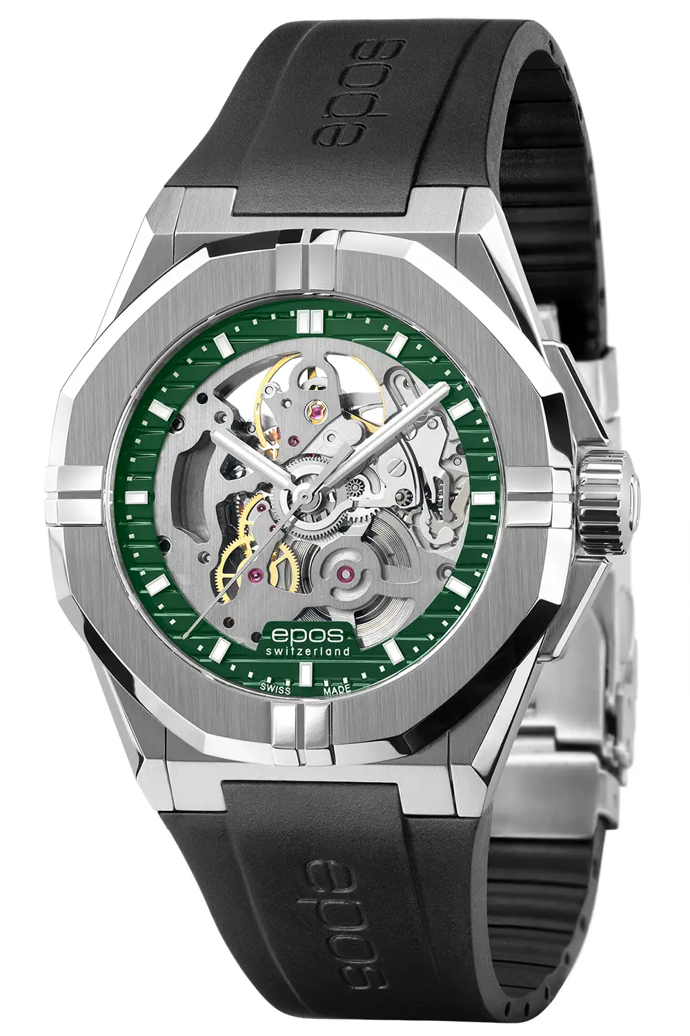 Ocelové pouzdro 41 mm vytváří rám pro zelený kroužek indexů, který podtrhuje hloubku konstrukce a zachovává dobrou čitelnost i přes ažurovou strukturu. Hodinky lze obdivovat z obou stran – přední část exponuje strojek pod safírovým sklíčkem a transparentní víko odhaluje ruční zdobení a zpracování charakteristické pro manufakturu Epos. Vodotěsnost 10 ATM, ocelový náramek s plnými články a sportovní architektura pouzdra způsobují, že model si zachovává každodenní užitečnost.